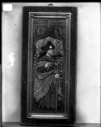 | Keywords: Master of the Orléans Triptych - Left Wing of a Triptych - St James - Walters 44128.jpg St James the Greater is represented in profile as if walking to the right He wears a purple robe a blue mantle with jeweled edges and a fantastic wide-brimmed hat turned down at the back and up in front where it is set with a cockle-shell The forefinger of his raised right hand is elongated a characteristic of this master His left hand grasps a long pilgrim's staff from which a triangular wallet is suspended The framework around the figure is made of two columns supporting an ogee arch with crockets on its extrados and spandrels decorated with small arches Behind the saint is a cloth of honor and a chapel-like enclosure with a groin-vault and a hanging keystone The floor is tiled For comparable figures by the same master see Walters 44 316 and 44 645 ca 1500 technique painted enamel copper cm 20 7 6 9 accession number 44 128 36140 Raoul Heilbronner Paris date of acquisition unknown by purchase Henry Walters Baltimore 1910 by purchase Walters Art Museum Henry Walters Acquired by Henry Walters 1910 place of origin Limoges France Walters Art Museum license Limoges painted enamels in the Walters Art Museum Master of the Orléans Triptych Media contributed by the Walters Art Museum needs category review Painted enamel art in the Walters Art Museum Wallets in art Pilgrim's staff |