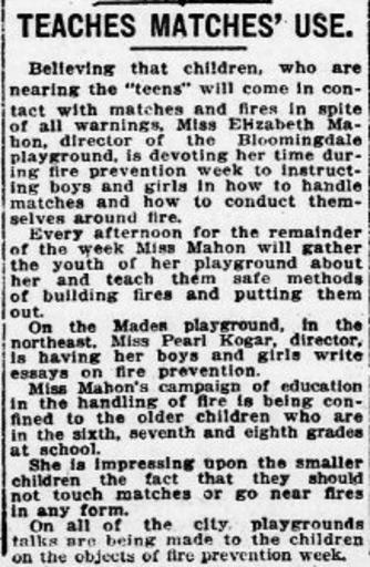 | Keywords: Article describing Elizabeth Mahon teaching about match and fire safety in Bloomingdale Playground. Original: <a href="http://chroniclingamerica.loc.gov/lccn/sn83045462/1921-10-13/ed-1/seq-2/" rel="nofollow">chroniclingamerica.loc.gov/lccn/sn83045462/1921-10-13/ed-...</a> fire safety matches mcmillanpark elizabethmahon bloomingdaleplayground |