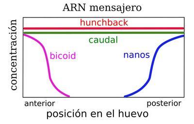 Keywords: Maternal effect mRNAs es.svg Drosophilas bicoid nanos caudal and hunchback mRNAs distribution in egg self-made Image Maternal_effect_mRNAs png-based 2008-02-12 Retama Heredity MRNA