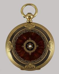 | Keywords: Mathey Peytieu - Ladies Hunting Case Watch - Walters 58287 - Back.jpg An 18K gold case with translucent enamel over guilloché surface revealing engraved patterns Enameled in the face of the case is a putto with flowers and on the reverse is finely engraved gold ground covered with brown transluscent enamel and set with a half-pearl between 1840 1849 gold translucent enamel over guilloché surface rose diamonds rubies half-pearl Diam 1 11/16 x D 3/8 in 4 29 x 0 95 cm accession number 58 287 35509 Rebecca Ulman Weil date of acquisition unknown by purchase Henrietta Lehmayer Moser 1898-1960 Baltimore 1936 by inheritance from her aunt Liz and Peter Moser Baltimore 1958-1959 by gift from his mother Walters Art Museum Gift of Liz and Peter Moser 2006 place of origin Le Locle Switzerland Walters Art Museum license Media contributed by the Walters Art Museum needs category review Timepieces in the Walters Art Museum Media contributed by the Walters Art Museum needs artist review Pocket watches Guilloché |