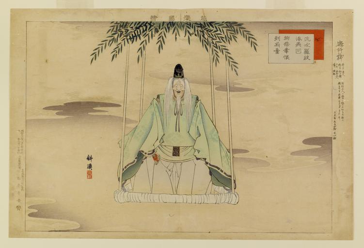 Keywords: Matsuke Heikichi - Nogaku zue - Walters 95270.jpg Walters Art Museum artwork Creator Daikokuya Matsuki Heikichi en When a piece of cloth is removed from a frame construction on stage the tree spirit is revealed It addresses a wandering Buddhist priest The willow tree has encountered The holy Law the teaching Of Amida who guides Even the crooked Straight to Paradise The spirit hopes that the priest by reciting the name of the Buddha Amida will help it attain rebirth in Amida's Western Paradise 1899 Meiji pigments mulberry paper cm 24 77 37 15 accession number 95 270 6993 Mr and Mrs C R Snell Jr date and mode of acquisition unknown Walters Art Museum Gift of Mr and Mrs C R Snell Jr 1989 Signature Kogyo place of origin Tokyo Japan Walters Art Museum license PD-old-auto 1927 2D Japanese prints in the Walters Art Museum Historic samurai prints Daikokuya Matsuki Heikichi Kōgyo Tsukioka Tree deities |