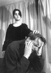 Keywords: Matthew Cox and Suzanne Rudd.jpg Exiled Theatre Exiled Theatre's first production of the play Some God Some Angel Some Devil Own Hambert ca 2004-01 2004-09 – 2008-10-09 Black and white photographs of women and men Plays Hands on head