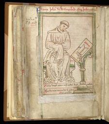 | Keywords: Matthew Paris drawing of John of Wallingford (1255) - BL Cotton MS Julius D VII, f.42v.jpg John of Wallingford d 1258 John of Wallingford seated reading at a lectern Drawn and inscribed by Matthew Paris after John of Wallingford's term as infirmarer at St Albans Cathedral St Albans Abbey 1255 Ink and pigments on vellum Institution British Library object history exhibition history credit line place of creation inscription Frater Johannes de Walingeford quandoque Infirmarius top la Brother John of Wallingford onetime Infirmarer inscription Salterium on lectern la Psalter inscription Tonsio larga comae nigra vestis bota rotunda / non faciunt monachum sed mens a crimine munda bottom la A wide tonsure of the hair a black robe a round boot / don't make a monk ; but a mind away from the sins of the world Image from British Library Online Gallery http //www bl uk/onlinegallery/onlineex/illmanus/cottmanucoll/d/011cotjuld00007u00042v00 html webpage http //ogimages bl uk/images/011/011COTJULD00007U00042V00 5BSVC2 5D jpg image accession number Cotton MS Julius D VII f 42v <gallery> File Matthew Paris drawing of John of Wallingford 1255 - BL Cotton MS Julius D VII f 42v cropped jpg Cropped version File Engraving after Matthew Paris drawing of John of Wallingford 1255 jpg 1892 engraving </gallery> PD-Art-100 Uploaded with UploadWizard John of Wallingford Collecteana c 1250s - BL Cotton MS Julius D VII |