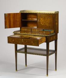 | Keywords: Maurice-Bernard Evalde - Lady's Desk - Walters 6560 - Three Quarter Left View B.jpg This desk bears the stamp of Evalde who became a master ébéniste or maker of inlaid furniture in 1765 He was responsible for the now lost jewel cabinet that King Louis XV of France presented to Marie-Antoinette on the occasion of her marriage to the future Louis XVI in 1770 The key to this desk bears the crown of France indicating that the piece may have been made for a member of the royal family The doors are inlaid in colored marquetry wood inlay Among the images found on the surface are a writing table and navigational instruments The desk's front drawer opens to reveal an inlaid writing surface which slides back to reveal compartments below ca 1770 oak marquetry in naturally colored and stained woods and gilded bronze cm 120 67 ; With drawers open cm 104 14 67 95 65 41 accession number 65 60 9586 La Comtesse Henri du Chastel de la Howarderie Belgium Sale Christies London December 4 1969 lot no 108 Ronald A Lee 1-9 Bruton Place London as agent Walters Art Museum 1969 by purchase Museum purchase in memory of Philip B Perlman 1969 place of origin Paris France Walters Art Museum license Maurice-Bernard Evalde Media contributed by the Walters Art Museum needs category review Furniture in the Walters Art Museum |