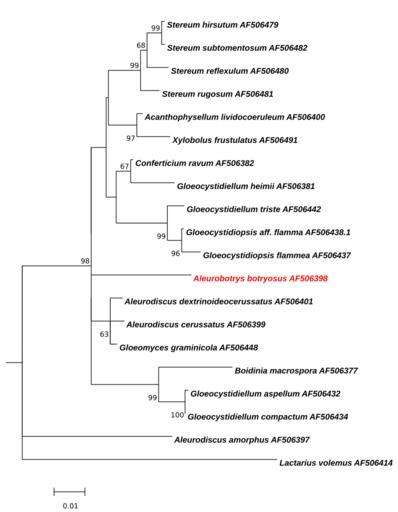 | Keywords: Maximum Likelihood -Tree-of-Aleurobotrys and related Taxa.svg Figure Figure Molecular Phylogenetic analysis of Aleurobotrys and related Taxa by Maximum Likelihood method <br/> The evolutionary history was inferred by using the Maximum Likelihood method based on the Kimura 2-parameter model 1 The tree with the highest log likelihood -3361 7056 is shown The percentage of trees in which the associated taxa clustered together is shown next to the branches A user-specified tree was used as an initial tree in the heuristic search A discrete Gamma distribution was used to model evolutionary rate differences among sites 5 categories +G parameter 0 5290 The rate variation model allowed for some sites to be evolutionarily invariable +I 69 0768 sites The tree is drawn to scale with branch lengths measured in the number of substitutions per site The analysis involved 20 nucleotide sequences All positions with less than 95 site coverage were eliminated That is fewer than 5 alignment gaps missing data and ambiguous bases were allowed at any position There were a total of 1171 positions in the final dataset Evolutionary analyses were conducted in http //megasoftware net/ MEGA6 2<br/> 1 Kimura M 1980 A simple method for estimating evolutionary rate of base substitutions through comparative studies of nucleotide sequences Journal of Molecular Evolution 16 111-120 <br/> 2 Tamura K Stecher G Peterson D Filipski A and Kumar S 2013 MEGA6 Molecular Evolutionary Genetics Analysis version 6 0 Molecular Biology and Evolution30 2725-2729 <br/> ; List with GenBank Sequences http //www ncbi nlm nih gov/nuccore/AF506479 Stereum hirsutum AF506479 http //www ncbi nlm nih gov/nuccore/AF506482 Stereum subtomentosum AF506482 http //www ncbi nlm nih gov/nuccore/AF506480 Stereum reflexulum AF506480 http //www ncbi nlm nih gov/nuccore/AF506481 Stereum rugosum AF506481 http //www ncbi nlm nih gov/nuccore/AF506400 Aleurodiscus lividocoeruleus AF506400 http //www ncbi nlm nih gov/nuccore/AF506491 Xylobolus frustulatus AF506491 http //www ncbi nlm nih gov/nuccore/AF506382 Conferticium ravum AF506382 http //www ncbi nlm nih gov/nuccore/AF506381 Gloeocystidiellum heimii AF506381 http //www ncbi nlm nih gov/nuccore/AF506442 Gloeocystidiellum triste AF506442 http //www ncbi nlm nih gov/nuccore/AF506438 Gloeocystidiopsis aff flamma AF506438 http //www ncbi nlm nih gov/nuccore/AF506437 Gloeocystidiopsis flammea AF506437 http //www ncbi nlm nih gov/nuccore/AF506398 Aleurobotrys botryosus AF506398 http //www ncbi nlm nih gov/nuccore/AF506401 Aleurodiscus dextrinoideocerussatus AF506401 http //www ncbi nlm nih gov/nuccore/AF506399 Aleurodiscus cerussatus AF506399 http //www ncbi nlm nih gov/nuccore/AF506448 Gloeomyces graminicola AF506448 http //www ncbi nlm nih gov/nuccore/AF506377 Boidinia macrospora AF506377 http //www ncbi nlm nih gov/nuccore/AF506432 Gloeocystidiellum aspellum AF506432 http //www ncbi nlm nih gov/nuccore/AF506434 Gloeocystidiellum compactum AF506434 http //www ncbi nlm nih gov/nuccore/AF506397 Aleurodiscus amorphus AF506397 http //www ncbi nlm nih gov/nuccore/AF506414 Lactarius volemus AF506414 own 2014-09-01 Thkgk Cc-zero Aleurobotrys botryosus Stereaceae |