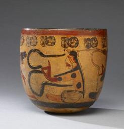 | Keywords: Mayan - Bowl - Walters 20092030 - Side B.jpg The shape of this vessel makes reference to the gourd which was and remains today the primary food-service and drinking container among the Maya and other Mesoamerican peoples The painted bowl is decorated with four seated human figures The black body-painting of some and the black spots on others suggest a supernatural identity or association for the group The moderately abstract elongated hand gestures are narrative signals which likely specify the nature of the interaction among the individuals For example the seated figure with three black spots on his torso and arm strikes a pose that may connote a generalized greeting Yet in spite of detailed studies of pose and gesture in Maya art the lack of corroborating evidence in the art historical archaeological and ethno-historic records continues to challenge all efforts to ascertain the true meanings of these formalized gestures AD 550-850 Late Classic earthenware slip paint cm 16 03 16 51 accession number 2009 20 30 80185 J Guy Puerto date and mode of acquisition unknown John G Bourne 1960 by purchase Walters Art Museum Gift of John Bourne 2009 place of origin Campeche Mexico Walters Art Museum license Maya art in the Walters Art Museum Maya bowls |