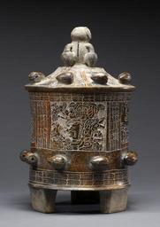 | Keywords: Mayan - Lidded Vessel - Walters 20092039 - Side B.jpg The Classic Maya political landscape was divided into more than two dozen polities similar to city-states composed of a primary site plus aligned towns and villages Each was headed by a royal lineage supported by noble families and the polities often competed against each other for political and economic supremacy Feasts sponsored by the ruling elite provided a crucial platform for securing relations among aligned parties and negotiating new alliances Feasts were integral to elaborate affairs of state from rulers' accession rites to royal weddings to war victory celebrations and special religious observances The consumption of large amounts of sumptuous foods including drinks made from highly valued cacao chocolate was a focal point The banquets prompted the production of finely made food-service wares in the form of pictorial pottery their decorative imagery often featuring themes lauding the earthly or supernatural prowess of the host These ornate vessels also functioned as gifts their acceptance signaling the guests' alliance or at least an association with the host The vase's hieroglyphic text confirms its function as a drinking vessel-kakaw yuk'ib or the cacao drinking cup of The text goes on to name the cup's patron/owner at B2 and his father at d1-d2 Chakjal Mukuuy Reddening Dove Neither of these individuals is known from other Early Classic hieroglyphic texts and thus we do not know their political or familial identities Yet the artistic quality of the vessel and its detailed nominal phrase indicate their being members of the nobility if not a royal dynasty of the fourth-fifth centuries The two hieroglyphic texts are separated by pictorial panels featuring the maize god as an embodied cacao tree His bejeweled headdress is topped by a sprouting cacao tree like those adorning the vase's lid Modeled cacao pods embellish the vessel and the lid's knob is a cacao tree with a bird now broken The avian may be the false sun of the previous creation and avatar of the deity Itz'amnaj God D Uniting text and image panels are overlapping bands of cacao leaves The preponderance of cacao imagery supports the interpretation of the text's unusual introductory glyphs a1-b1 as sprouting cacao based on the first sign's resemblance to the vase's sprouting trees see the Maize god's headdress and its sub-fixed sign -la a well-known adjectival element in Maya hieroglyphic writing AD 250-550 Early Classic earthenware slip with incising cm 34 77 22 86 accession number 2009 20 39 80194 Stendahl Galleries Los Angeles date and mode of acquisition unknown John G Bourne 1970s by purchase Walters Art Museum Gift of John Bourne 2009 place of origin Guatemala Walters Art Museum license Maya art in the Walters Art Museum Maya tripod vessels Media contributed by the Walters Art Museum needs category review Theobroma cacao in art Pre-Columbian art |