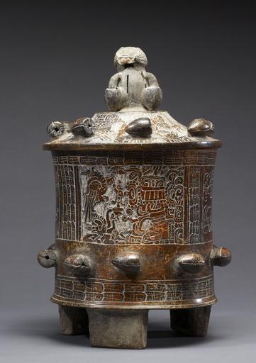 Keywords: Mayan - Lidded Vessel - Walters 20092039 - Side D.jpg The Classic Maya political landscape was divided into more than two dozen polities similar to city-states composed of a primary site plus aligned towns and villages Each was headed by a royal lineage supported by noble families and the polities often competed against each other for political and economic supremacy Feasts sponsored by the ruling elite provided a crucial platform for securing relations among aligned parties and negotiating new alliances Feasts were integral to elaborate affairs of state from rulers' accession rites to royal weddings to war victory celebrations and special religious observances The consumption of large amounts of sumptuous foods including drinks made from highly valued cacao chocolate was a focal point The banquets prompted the production of finely made food-service wares in the form of pictorial pottery their decorative imagery often featuring themes lauding the earthly or supernatural prowess of the host These ornate vessels also functioned as gifts their acceptance signaling the guests' alliance or at least an association with the host The vase's hieroglyphic text confirms its function as a drinking vessel-kakaw yuk'ib or the cacao drinking cup of The text goes on to name the cup's patron/owner at B2 and his father at d1-d2 Chakjal Mukuuy Reddening Dove Neither of these individuals is known from other Early Classic hieroglyphic texts and thus we do not know their political or familial identities Yet the artistic quality of the vessel and its detailed nominal phrase indicate their being members of the nobility if not a royal dynasty of the fourth-fifth centuries The two hieroglyphic texts are separated by pictorial panels featuring the maize god as an embodied cacao tree His bejeweled headdress is topped by a sprouting cacao tree like those adorning the vase's lid Modeled cacao pods embellish the vessel and the lid's knob is a cacao tree with a bird now broken The avian may be the false sun of the previous creation and avatar of the deity Itz'amnaj God D Uniting text and image panels are overlapping bands of cacao leaves The preponderance of cacao imagery supports the interpretation of the text's unusual introductory glyphs a1-b1 as sprouting cacao based on the first sign's resemblance to the vase's sprouting trees see the Maize god's headdress and its sub-fixed sign -la a well-known adjectival element in Maya hieroglyphic writing AD 250-550 Early Classic earthenware slip with incising cm 34 77 22 86 accession number 2009 20 39 80194 Stendahl Galleries Los Angeles date and mode of acquisition unknown John G Bourne 1970s by purchase Walters Art Museum Gift of John Bourne 2009 place of origin Guatemala Walters Art Museum license Maya art in the Walters Art Museum Maya tripod vessels Media contributed by the Walters Art Museum needs category review Theobroma cacao in art Maize god |