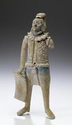 | Keywords: Mayan - Warrior Figurine - Walters 20092038 - Three Quarter.jpg Among the most renowned of the myriad figurine traditions of Mesoamerica is that of Jaina Island a residential and funerary settlement adjacent to the coast of west-central Campeche Jaina Island's extensive burial grounds have been known since the nineteenth century but only in the 1940s were they first scientifically excavated Archaeologists found figurines in the arms of the deceased who had been dressed in their finest clothes and wrapped in cotton burial shrouds and palm-fiber mats The renowned Mexico archaeologist Román Piña Chan the director of excavations at Jaina has speculated that the figurines served to ensure the deceased's lifeways and social position in the afterlife This figurine is notable because it portrays an elderly warrior rather than the robust young combatant so typical of Classic Maya figurines His identity is confirmed by the flexible rectangular shield held in his right hand and the quilted armor tunic both being requisite garb for Maya warriors He likely represents a captured warrior defiant yet stately in demeanor his defeat indicated by the thick rope binding his neck and upper arms The form of the head suggests that the figure originally was adorned with a removable headdress which has been lost AD 550-850 Late Classic earthenware post-fire paint cm 22 7 10 2 6 2 accession number 2009 20 38 80193 J Guy Puerto date and mode of acquisition unknown John G Bourne 1960s by purchase Walters Art Museum Gift of John Bourne 2009 place of origin Jaina Island in Campeche Mexico Walters Art Museum license Maya art in the Walters Art Museum Maya ceramic figurines Media contributed by the Walters Art Museum needs category review Jaina Island Quilted clothing |