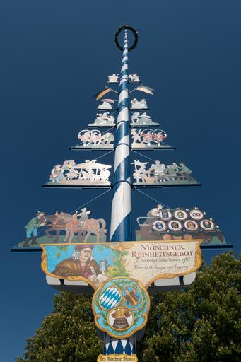 Keywords: maypole blue white bavaria tradition spring sky upper bavaria tree munich viktualienmarkt reinheitsgebot wreath