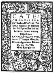 Keywords: Mazvydo katekizmas.jpg en Title page of the first published Lithuanian book 1547 http //pirmojiknyga mch mii lt/Puslapiai/katekizmas en htm Martynas Mažvydas PD-old catechisms 1547 books Martynas Mažvydas literature of Lithuania