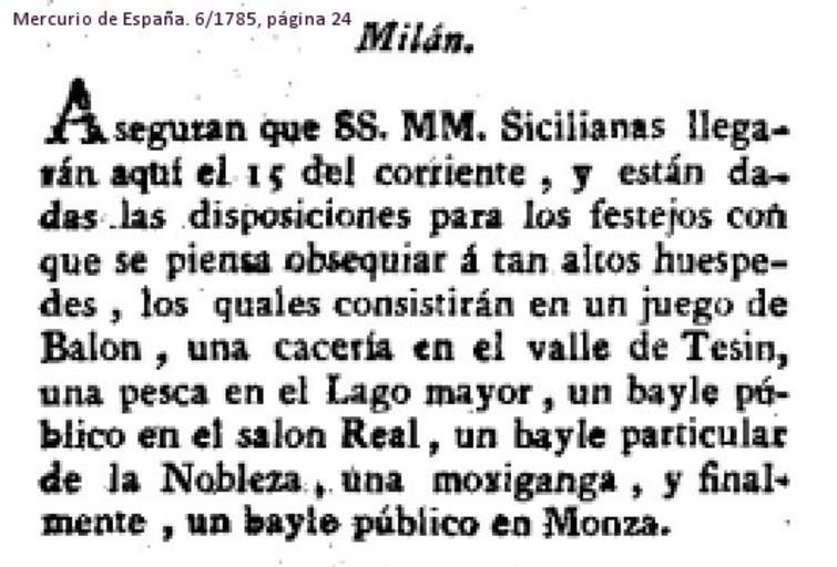 | Keywords: MB-Monza-1785-ballo-pubblico.jpg it Ballo pubblico alla Villa Reale di Monza in onore dei reali delle Due Sicilie in visita a Milano 1785 Mercurio de España 6/1785 pag 24 author it Traduzione dallo spagnolo in italiano Assicurano che le loro SS MM Siciliane Ferdinando I delle Due Sicilie con la prima moglie Maria Carolina d'Asburgo-Lorena arriveranno qui il 15 del corrente mese e sono state date le disposizioni per i festeggiamenti con i quali si ha intenzione di ossequiare ospiti di così alto lignaggio i quali festeggiamenti consisteranno in un gioco di Pallone una caccia nella valle del Ticino una pesca nel lago Maggiore un ballo pubblico nel salone reale un ballo particolare riservato alla nobiltà e finalmente un ballo pubblico a Monza PD-old-100 ImageNote 1 19 54 485 undefined 534 362 2 it Traduzione dallo spagnolo in italiano Assicurano che le loro SS MM Siciliane arriveranno qui il 15 del corrente mese e sono state date le disposizioni per i festeggiamenti con i quali si ha intenzione di ossequiare ospiti di così alto lignaggio i quali festeggiamenti consisteranno in un gioco di Pallone una caccia nella valle del Ticino una pesca nel lago Maggiore un ballo pubblico nel salone reale un ballo particolare riservato alla nobiltà un ballo folcloristico in strada e finalmente un ballo pubblico a Monza ImageNoteEnd 1 Uploaded with UploadWizard History of Monza Monza in the 1780s Mercurio de España 1785 in Italy |