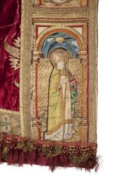 | Keywords: MCC-21485 Rode koorkap met verrijzenis op schild, aurifriezen met Bonifatius, Augustinus en Barbara (7).tif Artwork nl onbekend nl Koorkap van wijnrood zijdefluweel waarop met gouddraad grote gestyleerde bloemranken en bladeren geappliceerd zijn Op de rugzijde wordt op een koorkapschild onder drie halfronde baldakijnen met gewelven gescheiden door torentjes en in het midden een roosvenster de Verrijzenis van Christus afgebeeld Centraal op het schild staat Christus verrezen uit het graf gehuld in koormantel met agrafe In de linkerhand houdt hij een kruisvaan met de rechter maakt hij een zegenend gebaar Links van de geopende tombe naderen de drie Maria's Maria Magdalena Maria van Betthanië en een niet nader omschreven Maria Luc 7 36 om Christus' lichaam te balsemen Rechts 'Noli me tangere' 'Wil mij niet aanraken' Joh 20 11-19 waarin Maria Magdalena geknield opziet naar Christus die haar verschijnt als hovenier met een spade in de hand Aan weerskanten van het graf bewakers deels slapend; rechts schrikt een soldaat wakker Links op de achtergrond enkele gebouwen rechts een bergachtig Golgotha waarop de drie kruisen nog zichtbaar zijn De aurifriezen aan de voorkant van de mantel zijn van eerder datum ca 1490 Onder eenvoudige gotische baldakijnen worden tegen een gedamasceerde achtergrond in totaal acht heiligen en bisschoppen afgebeeld van wie er slechts drie middels een attribuut kunnen worden geïdentificeerd Op de linkerstrook wordt bovenaan Barbara uitgebeeld Het loshangend haar hangt over de schouders Ze houdt haar attribuut de toren in de rechterhand Onder Barbara in koormantel paus Cornelius met pausstaf in de linkerhand en tiara op het hoofd Zijn attribuut de hoorn houdt hij in de rechterhand Daaronder een bisschop of kerkvader met de staf in de rechterhand In de linker houdt hij een opengeslagen boek Onderaan weer een bisschop met een dicht boek in de rechterhand en een staf in de linkerhand Op de rechterkolom bovenaan een onbekende bisschop gevolgd door een bisschop die onder de koormantel een maliënkolder draagt Ansfridus Aan zijn voeten een wapenschildmet afwisselend rode en gouden stroken Daaronder de kerkvader Augustinus met zijn attribuut een hart in de linkerhand Rechts houdt hij de bisschopsstaf Onderaan een vierde bisschop of kerkvader die met beide handen een open boek vasthoudt Techniek het opmerkelijke van het weefsel is dat de motieven niet in de stof geweven zijn De gouddraden zijn eerst op een rode katoenen ondergrond gelegd en gehecht en later op het fluweel geappliceerd niet opgehoogd In het borduurwerk op het schild is voor de mantel van Christus en overige kleding de lazuurtechniek toegepast In de architectuur en achtergrond is gebruik gemaakt van deels opgehoogd gehecht en gelegd gouddraad De lichaamspartijen en het graslandschap zijn met zijde in de ingrijpsteek aangebracht De achtergrond van de figuren aan de voorkant van de koorkap is van gelegd en in blokjesmotief gehecht gouddraad Ook in de attributen en de architectuur is gebruik gemaakt van gouddraad De gezichten handen en mantels zijn van zijde in ingrijpsteek De tegelvloertjes zijn van gelegde en met gouddraad gehechte zijde Staat het zijdeborduuwerk aan de voorkant is hier en daar versleten; de gouden draden hangen deels los Staat een deel van de gelegde en met zijde gehechte gouddraden van de applicaties op het weefsel zijn losgeraakt Ook in het borduurwerk zitten enkele losse draden De zoom van de groen zijden voering is voor een groot deel versleten De franje onder aan de koorkap is uit later tijd 17de eeuw between 1490 1519 nl fluweel zijde gouddraad Size 148 322 cm Institution Museum Catharijneconvent place of discovery object history exhibition history credit line nl Foto Museum Catharijneconvent Utrecht foto Ruben de Heer accession number Object number 21485 Inventory number BMH t622 place of creation nl Zuid-Nederland https //www catharijneconvent nl/adlib/21485/ View this work on the website of Museum Catharijneconvent Museum Catharijneconvent Cc-zero Textiles in the Museum Catharijneconvent Media contributed by Museum Catharijneconvent Uploaded with pattypan |