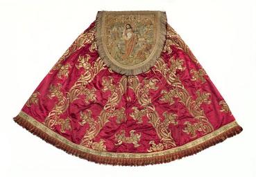 | Keywords: MCC-21485 Rode koorkap met verrijzenis op schild, aurifriezen met Bonifatius, Augustinus en Barbara (2).tif Artwork nl onbekend nl Koorkap van wijnrood zijdefluweel waarop met gouddraad grote gestyleerde bloemranken en bladeren geappliceerd zijn Op de rugzijde wordt op een koorkapschild onder drie halfronde baldakijnen met gewelven gescheiden door torentjes en in het midden een roosvenster de Verrijzenis van Christus afgebeeld Centraal op het schild staat Christus verrezen uit het graf gehuld in koormantel met agrafe In de linkerhand houdt hij een kruisvaan met de rechter maakt hij een zegenend gebaar Links van de geopende tombe naderen de drie Maria's Maria Magdalena Maria van Betthanië en een niet nader omschreven Maria Luc 7 36 om Christus' lichaam te balsemen Rechts 'Noli me tangere' 'Wil mij niet aanraken' Joh 20 11-19 waarin Maria Magdalena geknield opziet naar Christus die haar verschijnt als hovenier met een spade in de hand Aan weerskanten van het graf bewakers deels slapend; rechts schrikt een soldaat wakker Links op de achtergrond enkele gebouwen rechts een bergachtig Golgotha waarop de drie kruisen nog zichtbaar zijn De aurifriezen aan de voorkant van de mantel zijn van eerder datum ca 1490 Onder eenvoudige gotische baldakijnen worden tegen een gedamasceerde achtergrond in totaal acht heiligen en bisschoppen afgebeeld van wie er slechts drie middels een attribuut kunnen worden geïdentificeerd Op de linkerstrook wordt bovenaan Barbara uitgebeeld Het loshangend haar hangt over de schouders Ze houdt haar attribuut de toren in de rechterhand Onder Barbara in koormantel paus Cornelius met pausstaf in de linkerhand en tiara op het hoofd Zijn attribuut de hoorn houdt hij in de rechterhand Daaronder een bisschop of kerkvader met de staf in de rechterhand In de linker houdt hij een opengeslagen boek Onderaan weer een bisschop met een dicht boek in de rechterhand en een staf in de linkerhand Op de rechterkolom bovenaan een onbekende bisschop gevolgd door een bisschop die onder de koormantel een maliënkolder draagt Ansfridus Aan zijn voeten een wapenschildmet afwisselend rode en gouden stroken Daaronder de kerkvader Augustinus met zijn attribuut een hart in de linkerhand Rechts houdt hij de bisschopsstaf Onderaan een vierde bisschop of kerkvader die met beide handen een open boek vasthoudt Techniek het opmerkelijke van het weefsel is dat de motieven niet in de stof geweven zijn De gouddraden zijn eerst op een rode katoenen ondergrond gelegd en gehecht en later op het fluweel geappliceerd niet opgehoogd In het borduurwerk op het schild is voor de mantel van Christus en overige kleding de lazuurtechniek toegepast In de architectuur en achtergrond is gebruik gemaakt van deels opgehoogd gehecht en gelegd gouddraad De lichaamspartijen en het graslandschap zijn met zijde in de ingrijpsteek aangebracht De achtergrond van de figuren aan de voorkant van de koorkap is van gelegd en in blokjesmotief gehecht gouddraad Ook in de attributen en de architectuur is gebruik gemaakt van gouddraad De gezichten handen en mantels zijn van zijde in ingrijpsteek De tegelvloertjes zijn van gelegde en met gouddraad gehechte zijde Staat het zijdeborduuwerk aan de voorkant is hier en daar versleten; de gouden draden hangen deels los Staat een deel van de gelegde en met zijde gehechte gouddraden van de applicaties op het weefsel zijn losgeraakt Ook in het borduurwerk zitten enkele losse draden De zoom van de groen zijden voering is voor een groot deel versleten De franje onder aan de koorkap is uit later tijd 17de eeuw between 1490 1519 nl fluweel zijde gouddraad Size 148 322 cm Institution Museum Catharijneconvent place of discovery object history exhibition history credit line nl Foto Museum Catharijneconvent Utrecht foto Ruben de Heer accession number Object number 21485 Inventory number BMH t622 place of creation nl Zuid-Nederland https //www catharijneconvent nl/adlib/21485/ View this work on the website of Museum Catharijneconvent Museum Catharijneconvent Cc-zero Textiles in the Museum Catharijneconvent Media contributed by Museum Catharijneconvent Uploaded with pattypan |