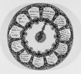 | Keywords: MCC-32663 Predikantenbord met wijzer, met zomerrooster van predikanten te Rotterdam (1).tif Artwork nl Anonymous nl Twee predikantenborden uit Delft en Rotterdam Delft 1736 en 18e eeuw StCC v16 en RMCC v17 Bruikleen Rijksmuseum Amsterdam Stadspredikanten van de officiƫle gereformeerde kerk preken in de zeventiende en achttiende eeuw niet in een vast kerkgebouw in hun stad Volgens een rouleersysteem krijgen zij voor de diensten elke zondag een ander kerkgebouw toegewezen Het ene bord toont het rooster van predikanten te Rotterdam Door de wijzer van het bord te draaien kunnen predikanten bepalen waar zij de volgende keer moeten preken of catechiseren Het andere bord geeft de preekbeurten aan in de Oude en Nieuwe Kerk te Delft between 1700 1799 nl aardewerk metaal Size 3 5 cm nl Hoogte 3 5cm Diameter 25 5cm Institution Museum Catharijneconvent object history exhibition history credit line nl Object bruikleen Rijksmuseum Amsterdam Foto Museum Catharijneconvent Utrecht foto Ruben de Heer accession number Object number 32663 Inventory number RMCC v00017 place of creation https //www catharijneconvent nl/adlib/32663/ View this work on the website of Museum Catharijneconvent Museum Catharijneconvent Cc-zero <gallery> File MCC-32663_Predikantenbord_met_wijzer _met_zomerrooster_van_predikanten_te_Rotterdam_ 1 tif </gallery> Collections of Museum Catharijneconvent Media contributed by Museum Catharijneconvent People of Rotterdam |