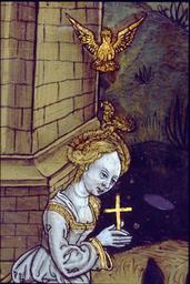 | Keywords: MCC-42054 Veelluik met het martelaarschap van de H. Theodosia (26).jpg Artwork nl Anonymous Gelre nl Middenstuk 1 Theodosia verzoekt toelating tot de gevangenis Rechtsboven een engel met banderol waarop de tekst Ghi sijt verhoert die geve die ghi do bidt heb ick gevestigt mit mijnen gelt die martelie te liden 2 Theodosia wordt bij de magistraat ter verantwoording geroepen Op het tekstbord Desen s alch sal ick mitter hulpen des heren voer s en 3 Theodosia ™s marteling aan de hefboom Op het tekstbord Ic ben bereyd dinc voer iezus christo te liden 4a Theodosia aan de schandpaal 4b Theodosia ™s ledematen worden uitgerekt 5 Allegorische voorstelling Christus aan het kruis met het offerlam op zijn schouders; onder het kruis negen schapen Op de voorgrond links een non rechts koning David met een gouden kroon op zijn hoofd en een herdersstaf met schep in beide handen die hij naar de non uitsteekt; tussen hen in ligt een harp Op het tekstbord suster hoede die scapen dier gedacten in die minne des brudegoms iesus opten berch caluarie 6a Theodosia uit het water gered door twee engelen 6b Vijf nonnen en een vrouw in wereldse kledij bezoeken Theodosia in de gevangenis Op het tekstbord min medes elen in cro Christo den enge w ech Het opschrift op de lijst onder de voorstelling is onleesbaar 7 Theodosia voor de wilde dieren geworpen Op het tekstbord nu suldi bekennen hoe vol si vermogen die god mit pueren herten minnen 8 Onthoofding van Theodosia Op het tekstbord dat ic inren tiit des vreden heb vercregen dat sal ic inden striit nie verliesen 9a Verschijning van Theodosia aan haar ouders Op het tekstbord sieh hoe soet die glorie ist daer du mi af beroeven wolste 9b Begrafenis van Theodosia Een zwevende engel met banderol waarop si heft nu salighe vrocht Aan weerszijden van deze taferelen zijn vrouwelijke heiligen afgebeeld steeds twee aan twee met tussen hen in een geknielde non Op de eerste voorstelling links in plaats van een vrouwelijke heilige Maria met kind Links 10a Madonna op de maansikkel en Fides Opschriften / fides 10b Caritas en Spes Opschriften niet leesbaar 11a Agatha en Dorothea Opschriften aghata / doratea 11b Apollonia met attribuut van Agatha tang waarin in plaats van een tand een borst is geklemd en Euphrosia Opschriften appolonia / effrosia 12a Anatolia en Christina Opschriften anatolia / 12b Victoria en Sophia Opschriften victoria / sophia Rechts 13a Margaretha en Gertrudis Opschriften a gretha / gertrudis 13b Ursula en Walburga Opschriften ursula / 14a Catharina en Barbara Opschriften katrina / barbara 14b Agnes en Prisca Opschriften agneta / priska 15a Cecilia en Cunera Opschriften cecilia / cunera 15b Lucia en Clara Opschriften lucia / clara Binnenzijde linkerluiken 16 Kruisdraging met Veronica en Simon van Cyrene 17 Doornenkroning Rechts een als priester geklede heilige met een kelk in de hand en een knielende non 18 Geseling Rechts een H Bisschop 19 Christus in de Hof van Olijven en de stigmatisatie van de Franciscus 20 Besnijdenis Rechts een reguliere kanunnik en een geknielde vrouw in 16de-eeuwse kledij met de attributen van de H Goedele een lantaarn geflankeerd door een engel met een brandende kaars en een duivel met een blaasbalg; daaronder het opschrift gudila 21 Ontkleding van Christus Rechts een heilige met een boek en een ladder 22 Kruisnageling Rechts de apostel Thomas 23 Christus aan het kruis met Maria Johannes en de drie vrouwen Rechts Antonius 24 Bewening Rechts de apostel Paulus en twee geknielde nonnen 25 Christus treedt de wijnpers Links Augustinus rechts een reguliere kanunnik Binnenzijde rechterluiken 26 Aanbidding der koningen 27 Geboorte van Christus Opschrift gloria in excelsis 28a Visitatie 28b Vier nonnen knielend voor een altaar waarop een drieluik met de Kruisiging Achter hen een priester Boven diens hoofd h ia Rechts daarvan een banderol met eenregelige tekst van een lied adv i g i I Fi Filius dn domini 29 Annunciatie Opschrift ave gratia plena 30 Genadestoel Rechtsonder op de voorgrond knielt een non Op het tekstbord god die alle creatueren gescapen heft en ons mit sin dierbaren bloet verlost heft hi wil ock sin gracie geuen ge eit v an der oude naam van de stichtster-non 31 Christus verschijnt aan Maria 32 Hemelvaart van Christus 33 Kroning van Maria 34 Allegorische voorstelling God de Vader gezeten op een troon met op de trappen die naar de troon voeren links de vijf wijze rechts de vijf dwaze maagden; in het midden een engel boven de hellemond met drie verdoemden Op de banderol in de linkerhand van de engel Gae t of Myt ghi vermadi vermaledijden ; op de banderol in zijn rechterhand coemt ghi gebenedide Op het tekstbord bij de wijze maagden gaet tot der gene daer se te coop is Op het tekstbord bij de dwaze maagden geft ons den olie vor ons lamp Op de banderol aan de onderzijde van de voorstelling rick der hemelen sal worden all fiere maechden Buitenzijde linkerluiken Nr 35 36 en 40 t/m 44 zijn gewijd aan de zeven vallen van Christus De voorstellingen zijn zeer verwant aan zeven houtsneden met dit thema gedrukt op één blad getiteld ˜O mensch betracht dy siben vell Christi und dy siben herzenlaydt Marie ™ Wenen Albertina inv nr 1930-70 Zuid-Duitsland ca 1480; zie Marrow 1979 p 82 89 100 106 131 170 pl VIII 35 Christus ™ val voor de kruisnageling zesde val 36 Kruisoprichting zevende val 37 Allegorische voorstelling Christus als Man van Smarten en gebonden aan de geselpaal houdt een rood koord vast dat verbonden is met een knielende non Tekstrol Christus o dochter vollighet my want ic gepassijt bin voor di wilt mij u hert geven om ewich te leuen Tekstrol non here ic offer u myn hert nu ende inder ewicheit Achter de non zeven kleinere opschriften verwijzend naar zeven deugden elk voorafgegaan door een hand met een geselroede waarvan de eerste en de derde onleesbaar zijn 2 die mel it mildheid ; 4 gehoorsamheijt; 5 wakinge; 6 silencia ; 7 arheyt waarheid 38 Allegorische voorstelling In een ommuurde tuin slaat Christus met een hamer o