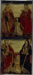 | Keywords: MCC-42054 Veelluik met het martelaarschap van de H. Theodosia (41).jpg Artwork nl Anonymous Gelre nl Middenstuk 1 Theodosia verzoekt toelating tot de gevangenis Rechtsboven een engel met banderol waarop de tekst Ghi sijt verhoert die geve die ghi do bidt heb ick gevestigt mit mijnen gelt die martelie te liden 2 Theodosia wordt bij de magistraat ter verantwoording geroepen Op het tekstbord Desen s alch sal ick mitter hulpen des heren voer s en 3 Theodosia ™s marteling aan de hefboom Op het tekstbord Ic ben bereyd dinc voer iezus christo te liden 4a Theodosia aan de schandpaal 4b Theodosia ™s ledematen worden uitgerekt 5 Allegorische voorstelling Christus aan het kruis met het offerlam op zijn schouders; onder het kruis negen schapen Op de voorgrond links een non rechts koning David met een gouden kroon op zijn hoofd en een herdersstaf met schep in beide handen die hij naar de non uitsteekt; tussen hen in ligt een harp Op het tekstbord suster hoede die scapen dier gedacten in die minne des brudegoms iesus opten berch caluarie 6a Theodosia uit het water gered door twee engelen 6b Vijf nonnen en een vrouw in wereldse kledij bezoeken Theodosia in de gevangenis Op het tekstbord min medes elen in cro Christo den enge w ech Het opschrift op de lijst onder de voorstelling is onleesbaar 7 Theodosia voor de wilde dieren geworpen Op het tekstbord nu suldi bekennen hoe vol si vermogen die god mit pueren herten minnen 8 Onthoofding van Theodosia Op het tekstbord dat ic inren tiit des vreden heb vercregen dat sal ic inden striit nie verliesen 9a Verschijning van Theodosia aan haar ouders Op het tekstbord sieh hoe soet die glorie ist daer du mi af beroeven wolste 9b Begrafenis van Theodosia Een zwevende engel met banderol waarop si heft nu salighe vrocht Aan weerszijden van deze taferelen zijn vrouwelijke heiligen afgebeeld steeds twee aan twee met tussen hen in een geknielde non Op de eerste voorstelling links in plaats van een vrouwelijke heilige Maria met kind Links 10a Madonna op de maansikkel en Fides Opschriften / fides 10b Caritas en Spes Opschriften niet leesbaar 11a Agatha en Dorothea Opschriften aghata / doratea 11b Apollonia met attribuut van Agatha tang waarin in plaats van een tand een borst is geklemd en Euphrosia Opschriften appolonia / effrosia 12a Anatolia en Christina Opschriften anatolia / 12b Victoria en Sophia Opschriften victoria / sophia Rechts 13a Margaretha en Gertrudis Opschriften a gretha / gertrudis 13b Ursula en Walburga Opschriften ursula / 14a Catharina en Barbara Opschriften katrina / barbara 14b Agnes en Prisca Opschriften agneta / priska 15a Cecilia en Cunera Opschriften cecilia / cunera 15b Lucia en Clara Opschriften lucia / clara Binnenzijde linkerluiken 16 Kruisdraging met Veronica en Simon van Cyrene 17 Doornenkroning Rechts een als priester geklede heilige met een kelk in de hand en een knielende non 18 Geseling Rechts een H Bisschop 19 Christus in de Hof van Olijven en de stigmatisatie van de Franciscus 20 Besnijdenis Rechts een reguliere kanunnik en een geknielde vrouw in 16de-eeuwse kledij met de attributen van de H Goedele een lantaarn geflankeerd door een engel met een brandende kaars en een duivel met een blaasbalg; daaronder het opschrift gudila 21 Ontkleding van Christus Rechts een heilige met een boek en een ladder 22 Kruisnageling Rechts de apostel Thomas 23 Christus aan het kruis met Maria Johannes en de drie vrouwen Rechts Antonius 24 Bewening Rechts de apostel Paulus en twee geknielde nonnen 25 Christus treedt de wijnpers Links Augustinus rechts een reguliere kanunnik Binnenzijde rechterluiken 26 Aanbidding der koningen 27 Geboorte van Christus Opschrift gloria in excelsis 28a Visitatie 28b Vier nonnen knielend voor een altaar waarop een drieluik met de Kruisiging Achter hen een priester Boven diens hoofd h ia Rechts daarvan een banderol met eenregelige tekst van een lied adv i g i I Fi Filius dn domini 29 Annunciatie Opschrift ave gratia plena 30 Genadestoel Rechtsonder op de voorgrond knielt een non Op het tekstbord god die alle creatueren gescapen heft en ons mit sin dierbaren bloet verlost heft hi wil ock sin gracie geuen ge eit v an der oude naam van de stichtster-non 31 Christus verschijnt aan Maria 32 Hemelvaart van Christus 33 Kroning van Maria 34 Allegorische voorstelling God de Vader gezeten op een troon met op de trappen die naar de troon voeren links de vijf wijze rechts de vijf dwaze maagden; in het midden een engel boven de hellemond met drie verdoemden Op de banderol in de linkerhand van de engel Gae t of Myt ghi vermadi vermaledijden ; op de banderol in zijn rechterhand coemt ghi gebenedide Op het tekstbord bij de wijze maagden gaet tot der gene daer se te coop is Op het tekstbord bij de dwaze maagden geft ons den olie vor ons lamp Op de banderol aan de onderzijde van de voorstelling rick der hemelen sal worden all fiere maechden Buitenzijde linkerluiken Nr 35 36 en 40 t/m 44 zijn gewijd aan de zeven vallen van Christus De voorstellingen zijn zeer verwant aan zeven houtsneden met dit thema gedrukt op één blad getiteld ˜O mensch betracht dy siben vell Christi und dy siben herzenlaydt Marie ™ Wenen Albertina inv nr 1930-70 Zuid-Duitsland ca 1480; zie Marrow 1979 p 82 89 100 106 131 170 pl VIII 35 Christus ™ val voor de kruisnageling zesde val 36 Kruisoprichting zevende val 37 Allegorische voorstelling Christus als Man van Smarten en gebonden aan de geselpaal houdt een rood koord vast dat verbonden is met een knielende non Tekstrol Christus o dochter vollighet my want ic gepassijt bin voor di wilt mij u hert geven om ewich te leuen Tekstrol non here ic offer u myn hert nu ende inder ewicheit Achter de non zeven kleinere opschriften verwijzend naar zeven deugden elk voorafgegaan door een hand met een geselroede waarvan de eerste en de derde onleesbaar zijn 2 die mel it mildheid ; 4 gehoorsamheijt; 5 wakinge; 6 silencia ; 7 arheyt waarheid 38 Allegorische voorstelling In een ommuurde tuin slaat Christus met een hamer o