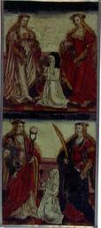 | Keywords: MCC-42054 Veelluik met het martelaarschap van de H. Theodosia (32).jpg Artwork nl Anonymous Gelre nl Middenstuk 1 Theodosia verzoekt toelating tot de gevangenis Rechtsboven een engel met banderol waarop de tekst Ghi sijt verhoert die geve die ghi do bidt heb ick gevestigt mit mijnen gelt die martelie te liden 2 Theodosia wordt bij de magistraat ter verantwoording geroepen Op het tekstbord Desen s alch sal ick mitter hulpen des heren voer s en 3 Theodosia ™s marteling aan de hefboom Op het tekstbord Ic ben bereyd dinc voer iezus christo te liden 4a Theodosia aan de schandpaal 4b Theodosia ™s ledematen worden uitgerekt 5 Allegorische voorstelling Christus aan het kruis met het offerlam op zijn schouders; onder het kruis negen schapen Op de voorgrond links een non rechts koning David met een gouden kroon op zijn hoofd en een herdersstaf met schep in beide handen die hij naar de non uitsteekt; tussen hen in ligt een harp Op het tekstbord suster hoede die scapen dier gedacten in die minne des brudegoms iesus opten berch caluarie 6a Theodosia uit het water gered door twee engelen 6b Vijf nonnen en een vrouw in wereldse kledij bezoeken Theodosia in de gevangenis Op het tekstbord min medes elen in cro Christo den enge w ech Het opschrift op de lijst onder de voorstelling is onleesbaar 7 Theodosia voor de wilde dieren geworpen Op het tekstbord nu suldi bekennen hoe vol si vermogen die god mit pueren herten minnen 8 Onthoofding van Theodosia Op het tekstbord dat ic inren tiit des vreden heb vercregen dat sal ic inden striit nie verliesen 9a Verschijning van Theodosia aan haar ouders Op het tekstbord sieh hoe soet die glorie ist daer du mi af beroeven wolste 9b Begrafenis van Theodosia Een zwevende engel met banderol waarop si heft nu salighe vrocht Aan weerszijden van deze taferelen zijn vrouwelijke heiligen afgebeeld steeds twee aan twee met tussen hen in een geknielde non Op de eerste voorstelling links in plaats van een vrouwelijke heilige Maria met kind Links 10a Madonna op de maansikkel en Fides Opschriften / fides 10b Caritas en Spes Opschriften niet leesbaar 11a Agatha en Dorothea Opschriften aghata / doratea 11b Apollonia met attribuut van Agatha tang waarin in plaats van een tand een borst is geklemd en Euphrosia Opschriften appolonia / effrosia 12a Anatolia en Christina Opschriften anatolia / 12b Victoria en Sophia Opschriften victoria / sophia Rechts 13a Margaretha en Gertrudis Opschriften a gretha / gertrudis 13b Ursula en Walburga Opschriften ursula / 14a Catharina en Barbara Opschriften katrina / barbara 14b Agnes en Prisca Opschriften agneta / priska 15a Cecilia en Cunera Opschriften cecilia / cunera 15b Lucia en Clara Opschriften lucia / clara Binnenzijde linkerluiken 16 Kruisdraging met Veronica en Simon van Cyrene 17 Doornenkroning Rechts een als priester geklede heilige met een kelk in de hand en een knielende non 18 Geseling Rechts een H Bisschop 19 Christus in de Hof van Olijven en de stigmatisatie van de Franciscus 20 Besnijdenis Rechts een reguliere kanunnik en een geknielde vrouw in 16de-eeuwse kledij met de attributen van de H Goedele een lantaarn geflankeerd door een engel met een brandende kaars en een duivel met een blaasbalg; daaronder het opschrift gudila 21 Ontkleding van Christus Rechts een heilige met een boek en een ladder 22 Kruisnageling Rechts de apostel Thomas 23 Christus aan het kruis met Maria Johannes en de drie vrouwen Rechts Antonius 24 Bewening Rechts de apostel Paulus en twee geknielde nonnen 25 Christus treedt de wijnpers Links Augustinus rechts een reguliere kanunnik Binnenzijde rechterluiken 26 Aanbidding der koningen 27 Geboorte van Christus Opschrift gloria in excelsis 28a Visitatie 28b Vier nonnen knielend voor een altaar waarop een drieluik met de Kruisiging Achter hen een priester Boven diens hoofd h ia Rechts daarvan een banderol met eenregelige tekst van een lied adv i g i I Fi Filius dn domini 29 Annunciatie Opschrift ave gratia plena 30 Genadestoel Rechtsonder op de voorgrond knielt een non Op het tekstbord god die alle creatueren gescapen heft en ons mit sin dierbaren bloet verlost heft hi wil ock sin gracie geuen ge eit v an der oude naam van de stichtster-non 31 Christus verschijnt aan Maria 32 Hemelvaart van Christus 33 Kroning van Maria 34 Allegorische voorstelling God de Vader gezeten op een troon met op de trappen die naar de troon voeren links de vijf wijze rechts de vijf dwaze maagden; in het midden een engel boven de hellemond met drie verdoemden Op de banderol in de linkerhand van de engel Gae t of Myt ghi vermadi vermaledijden ; op de banderol in zijn rechterhand coemt ghi gebenedide Op het tekstbord bij de wijze maagden gaet tot der gene daer se te coop is Op het tekstbord bij de dwaze maagden geft ons den olie vor ons lamp Op de banderol aan de onderzijde van de voorstelling rick der hemelen sal worden all fiere maechden Buitenzijde linkerluiken Nr 35 36 en 40 t/m 44 zijn gewijd aan de zeven vallen van Christus De voorstellingen zijn zeer verwant aan zeven houtsneden met dit thema gedrukt op één blad getiteld ˜O mensch betracht dy siben vell Christi und dy siben herzenlaydt Marie ™ Wenen Albertina inv nr 1930-70 Zuid-Duitsland ca 1480; zie Marrow 1979 p 82 89 100 106 131 170 pl VIII 35 Christus ™ val voor de kruisnageling zesde val 36 Kruisoprichting zevende val 37 Allegorische voorstelling Christus als Man van Smarten en gebonden aan de geselpaal houdt een rood koord vast dat verbonden is met een knielende non Tekstrol Christus o dochter vollighet my want ic gepassijt bin voor di wilt mij u hert geven om ewich te leuen Tekstrol non here ic offer u myn hert nu ende inder ewicheit Achter de non zeven kleinere opschriften verwijzend naar zeven deugden elk voorafgegaan door een hand met een geselroede waarvan de eerste en de derde onleesbaar zijn 2 die mel it mildheid ; 4 gehoorsamheijt; 5 wakinge; 6 silencia ; 7 arheyt waarheid 38 Allegorische voorstelling In een ommuurde tuin slaat Christus met een hamer o