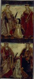 | Keywords: MCC-42054 Veelluik met het martelaarschap van de H. Theodosia (36).jpg Artwork nl Anonymous Gelre nl Middenstuk 1 Theodosia verzoekt toelating tot de gevangenis Rechtsboven een engel met banderol waarop de tekst Ghi sijt verhoert die geve die ghi do bidt heb ick gevestigt mit mijnen gelt die martelie te liden 2 Theodosia wordt bij de magistraat ter verantwoording geroepen Op het tekstbord Desen s alch sal ick mitter hulpen des heren voer s en 3 Theodosia ™s marteling aan de hefboom Op het tekstbord Ic ben bereyd dinc voer iezus christo te liden 4a Theodosia aan de schandpaal 4b Theodosia ™s ledematen worden uitgerekt 5 Allegorische voorstelling Christus aan het kruis met het offerlam op zijn schouders; onder het kruis negen schapen Op de voorgrond links een non rechts koning David met een gouden kroon op zijn hoofd en een herdersstaf met schep in beide handen die hij naar de non uitsteekt; tussen hen in ligt een harp Op het tekstbord suster hoede die scapen dier gedacten in die minne des brudegoms iesus opten berch caluarie 6a Theodosia uit het water gered door twee engelen 6b Vijf nonnen en een vrouw in wereldse kledij bezoeken Theodosia in de gevangenis Op het tekstbord min medes elen in cro Christo den enge w ech Het opschrift op de lijst onder de voorstelling is onleesbaar 7 Theodosia voor de wilde dieren geworpen Op het tekstbord nu suldi bekennen hoe vol si vermogen die god mit pueren herten minnen 8 Onthoofding van Theodosia Op het tekstbord dat ic inren tiit des vreden heb vercregen dat sal ic inden striit nie verliesen 9a Verschijning van Theodosia aan haar ouders Op het tekstbord sieh hoe soet die glorie ist daer du mi af beroeven wolste 9b Begrafenis van Theodosia Een zwevende engel met banderol waarop si heft nu salighe vrocht Aan weerszijden van deze taferelen zijn vrouwelijke heiligen afgebeeld steeds twee aan twee met tussen hen in een geknielde non Op de eerste voorstelling links in plaats van een vrouwelijke heilige Maria met kind Links 10a Madonna op de maansikkel en Fides Opschriften / fides 10b Caritas en Spes Opschriften niet leesbaar 11a Agatha en Dorothea Opschriften aghata / doratea 11b Apollonia met attribuut van Agatha tang waarin in plaats van een tand een borst is geklemd en Euphrosia Opschriften appolonia / effrosia 12a Anatolia en Christina Opschriften anatolia / 12b Victoria en Sophia Opschriften victoria / sophia Rechts 13a Margaretha en Gertrudis Opschriften a gretha / gertrudis 13b Ursula en Walburga Opschriften ursula / 14a Catharina en Barbara Opschriften katrina / barbara 14b Agnes en Prisca Opschriften agneta / priska 15a Cecilia en Cunera Opschriften cecilia / cunera 15b Lucia en Clara Opschriften lucia / clara Binnenzijde linkerluiken 16 Kruisdraging met Veronica en Simon van Cyrene 17 Doornenkroning Rechts een als priester geklede heilige met een kelk in de hand en een knielende non 18 Geseling Rechts een H Bisschop 19 Christus in de Hof van Olijven en de stigmatisatie van de Franciscus 20 Besnijdenis Rechts een reguliere kanunnik en een geknielde vrouw in 16de-eeuwse kledij met de attributen van de H Goedele een lantaarn geflankeerd door een engel met een brandende kaars en een duivel met een blaasbalg; daaronder het opschrift gudila 21 Ontkleding van Christus Rechts een heilige met een boek en een ladder 22 Kruisnageling Rechts de apostel Thomas 23 Christus aan het kruis met Maria Johannes en de drie vrouwen Rechts Antonius 24 Bewening Rechts de apostel Paulus en twee geknielde nonnen 25 Christus treedt de wijnpers Links Augustinus rechts een reguliere kanunnik Binnenzijde rechterluiken 26 Aanbidding der koningen 27 Geboorte van Christus Opschrift gloria in excelsis 28a Visitatie 28b Vier nonnen knielend voor een altaar waarop een drieluik met de Kruisiging Achter hen een priester Boven diens hoofd h ia Rechts daarvan een banderol met eenregelige tekst van een lied adv i g i I Fi Filius dn domini 29 Annunciatie Opschrift ave gratia plena 30 Genadestoel Rechtsonder op de voorgrond knielt een non Op het tekstbord god die alle creatueren gescapen heft en ons mit sin dierbaren bloet verlost heft hi wil ock sin gracie geuen ge eit v an der oude naam van de stichtster-non 31 Christus verschijnt aan Maria 32 Hemelvaart van Christus 33 Kroning van Maria 34 Allegorische voorstelling God de Vader gezeten op een troon met op de trappen die naar de troon voeren links de vijf wijze rechts de vijf dwaze maagden; in het midden een engel boven de hellemond met drie verdoemden Op de banderol in de linkerhand van de engel Gae t of Myt ghi vermadi vermaledijden ; op de banderol in zijn rechterhand coemt ghi gebenedide Op het tekstbord bij de wijze maagden gaet tot der gene daer se te coop is Op het tekstbord bij de dwaze maagden geft ons den olie vor ons lamp Op de banderol aan de onderzijde van de voorstelling rick der hemelen sal worden all fiere maechden Buitenzijde linkerluiken Nr 35 36 en 40 t/m 44 zijn gewijd aan de zeven vallen van Christus De voorstellingen zijn zeer verwant aan zeven houtsneden met dit thema gedrukt op één blad getiteld ˜O mensch betracht dy siben vell Christi und dy siben herzenlaydt Marie ™ Wenen Albertina inv nr 1930-70 Zuid-Duitsland ca 1480; zie Marrow 1979 p 82 89 100 106 131 170 pl VIII 35 Christus ™ val voor de kruisnageling zesde val 36 Kruisoprichting zevende val 37 Allegorische voorstelling Christus als Man van Smarten en gebonden aan de geselpaal houdt een rood koord vast dat verbonden is met een knielende non Tekstrol Christus o dochter vollighet my want ic gepassijt bin voor di wilt mij u hert geven om ewich te leuen Tekstrol non here ic offer u myn hert nu ende inder ewicheit Achter de non zeven kleinere opschriften verwijzend naar zeven deugden elk voorafgegaan door een hand met een geselroede waarvan de eerste en de derde onleesbaar zijn 2 die mel it mildheid ; 4 gehoorsamheijt; 5 wakinge; 6 silencia ; 7 arheyt waarheid 38 Allegorische voorstelling In een ommuurde tuin slaat Christus met een hamer o