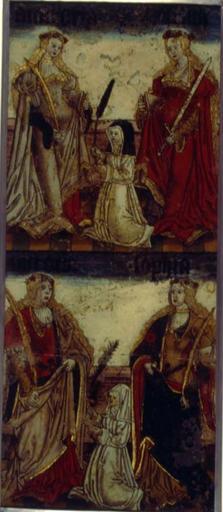 | Keywords: MCC-42054 Veelluik met het martelaarschap van de H. Theodosia (36).jpg  Artwork nl Anonymous Gelre nl Middenstuk 1 Theodosia verzoekt toelating tot de gevangenis Rechtsboven een engel met banderol waarop de tekst Ghi sijt verhoert die geve die ghi do bidt heb ick gevestigt mit mijnen gelt die martelie te liden 2 Theodosia wordt bij de magistraat ter verantwoording geroepen Op het tekstbord Desen s alch sal ick mitter hulpen des heren voer s en 3 Theodosia ™s marteling aan de hefboom Op het tekstbord Ic ben bereyd dinc voer iezus christo te liden 4a Theodosia aan de schandpaal 4b Theodosia ™s ledematen worden uitgerekt 5 Allegorische voorstelling Christus aan het kruis met het offerlam op zijn schouders; onder het kruis negen schapen Op de voorgrond links een non rechts koning David met een gouden kroon op zijn hoofd en een herdersstaf met schep in beide handen die hij naar de non uitsteekt; tussen hen in ligt een harp Op het tekstbord suster hoede die scapen dier gedacten in die minne des brudegoms iesus opten berch caluarie 6a Theodosia uit het water gered door twee engelen 6b Vijf nonnen en een vrouw in wereldse kledij bezoeken Theodosia in de gevangenis Op het tekstbord min medes elen in cro Christo den enge w ech Het opschrift op de lijst onder de voorstelling is onleesbaar 7 Theodosia voor de wilde dieren geworpen Op het tekstbord nu suldi bekennen hoe vol si vermogen die god mit pueren herten minnen 8 Onthoofding van Theodosia Op het tekstbord dat ic inren tiit des vreden heb vercregen dat sal ic inden striit nie verliesen 9a Verschijning van Theodosia aan haar ouders Op het tekstbord sieh hoe soet die glorie ist daer du mi af beroeven wolste 9b Begrafenis van Theodosia Een zwevende engel met banderol waarop si heft nu salighe vrocht Aan weerszijden van deze taferelen zijn vrouwelijke heiligen afgebeeld steeds twee aan twee met tussen hen in een geknielde non Op de eerste voorstelling links in plaats van een vrouwelijke heilige Maria met kind Links 10a Madonna op de maansikkel en Fides Opschriften / fides 10b Caritas en Spes Opschriften niet leesbaar 11a Agatha en Dorothea Opschriften aghata / doratea 11b Apollonia met attribuut van Agatha tang waarin in plaats van een tand een borst is geklemd en Euphrosia Opschriften appolonia / effrosia 12a Anatolia en Christina Opschriften anatolia / 12b Victoria en Sophia Opschriften victoria / sophia Rechts 13a Margaretha en Gertrudis Opschriften a gretha / gertrudis 13b Ursula en Walburga Opschriften ursula / 14a Catharina en Barbara Opschriften katrina / barbara 14b Agnes en Prisca Opschriften agneta / priska 15a Cecilia en Cunera Opschriften cecilia / cunera 15b Lucia en Clara Opschriften lucia / clara Binnenzijde linkerluiken 16 Kruisdraging met Veronica en Simon van Cyrene 17 Doornenkroning Rechts een als priester geklede heilige met een kelk in de hand en een knielende non 18 Geseling Rechts een H Bisschop 19 Christus in de Hof van Olijven en de stigmatisatie van de Franciscus 20 Besnijdenis Rechts een reguliere kanunnik en een geknielde vrouw in 16de-eeuwse kledij met de attributen van de H Goedele een lantaarn geflankeerd door een engel met een brandende kaars en een duivel met een blaasbalg; daaronder het opschrift gudila 21 Ontkleding van Christus Rechts een heilige met een boek en een ladder 22 Kruisnageling Rechts de apostel Thomas 23 Christus aan het kruis met Maria Johannes en de drie vrouwen Rechts Antonius 24 Bewening Rechts de apostel Paulus en twee geknielde nonnen 25 Christus treedt de wijnpers Links Augustinus rechts een reguliere kanunnik Binnenzijde rechterluiken 26 Aanbidding der koningen 27 Geboorte van Christus Opschrift gloria in excelsis 28a Visitatie 28b Vier nonnen knielend voor een altaar waarop een drieluik met de Kruisiging Achter hen een priester Boven diens hoofd h ia Rechts daarvan een banderol met eenregelige tekst van een lied adv i g i I Fi Filius dn domini 29 Annunciatie Opschrift ave gratia plena 30 Genadestoel Rechtsonder op de voorgrond knielt een non Op het tekstbord god die alle creatueren gescapen heft en ons mit sin dierbaren bloet verlost heft hi wil ock sin gracie geuen ge eit v an der oude naam van de stichtster-non 31 Christus verschijnt aan Maria 32 Hemelvaart van Christus 33 Kroning van Maria 34 Allegorische voorstelling God de Vader gezeten op een troon met op de trappen die naar de troon voeren links de vijf wijze rechts de vijf dwaze maagden; in het midden een engel boven de hellemond met drie verdoemden Op de banderol in de linkerhand van de engel Gae t of Myt ghi vermadi vermaledijden ; op de banderol in zijn rechterhand coemt ghi gebenedide Op het tekstbord bij de wijze maagden gaet tot der gene daer se te coop is Op het tekstbord bij de dwaze maagden geft ons den olie vor ons lamp Op de banderol aan de onderzijde van de voorstelling rick der hemelen sal worden all fiere maechden Buitenzijde linkerluiken Nr 35 36 en 40 t/m 44 zijn gewijd aan de zeven vallen van Christus De voorstellingen zijn zeer verwant aan zeven houtsneden met dit thema gedrukt op één blad getiteld ˜O mensch betracht dy siben vell Christi und dy siben herzenlaydt Marie ™ Wenen Albertina inv nr 1930-70 Zuid-Duitsland ca 1480; zie Marrow 1979 p 82 89 100 106 131 170 pl VIII 35 Christus ™ val voor de kruisnageling zesde val 36 Kruisoprichting zevende val 37 Allegorische voorstelling Christus als Man van Smarten en gebonden aan de geselpaal houdt een rood koord vast dat verbonden is met een knielende non Tekstrol Christus o dochter vollighet my want ic gepassijt bin voor di wilt mij u hert geven om ewich te leuen Tekstrol non here ic offer u myn hert nu ende inder ewicheit Achter de non zeven kleinere opschriften verwijzend naar zeven deugden elk voorafgegaan door een hand met een geselroede waarvan de eerste en de derde onleesbaar zijn 2 die mel it mildheid ; 4 gehoorsamheijt; 5 wakinge; 6 silencia ; 7 arheyt waarheid 38 Allegorische voorstelling In een ommuurde tuin slaat Christus met een hamer 