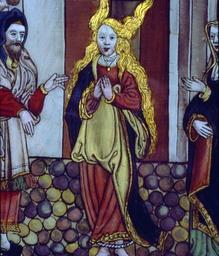 | Keywords: MCC-42054 Veelluik met het martelaarschap van de H. Theodosia (15).jpg Artwork nl Anonymous Gelre nl Middenstuk 1 Theodosia verzoekt toelating tot de gevangenis Rechtsboven een engel met banderol waarop de tekst Ghi sijt verhoert die geve die ghi do bidt heb ick gevestigt mit mijnen gelt die martelie te liden 2 Theodosia wordt bij de magistraat ter verantwoording geroepen Op het tekstbord Desen s alch sal ick mitter hulpen des heren voer s en 3 Theodosia ™s marteling aan de hefboom Op het tekstbord Ic ben bereyd dinc voer iezus christo te liden 4a Theodosia aan de schandpaal 4b Theodosia ™s ledematen worden uitgerekt 5 Allegorische voorstelling Christus aan het kruis met het offerlam op zijn schouders; onder het kruis negen schapen Op de voorgrond links een non rechts koning David met een gouden kroon op zijn hoofd en een herdersstaf met schep in beide handen die hij naar de non uitsteekt; tussen hen in ligt een harp Op het tekstbord suster hoede die scapen dier gedacten in die minne des brudegoms iesus opten berch caluarie 6a Theodosia uit het water gered door twee engelen 6b Vijf nonnen en een vrouw in wereldse kledij bezoeken Theodosia in de gevangenis Op het tekstbord min medes elen in cro Christo den enge w ech Het opschrift op de lijst onder de voorstelling is onleesbaar 7 Theodosia voor de wilde dieren geworpen Op het tekstbord nu suldi bekennen hoe vol si vermogen die god mit pueren herten minnen 8 Onthoofding van Theodosia Op het tekstbord dat ic inren tiit des vreden heb vercregen dat sal ic inden striit nie verliesen 9a Verschijning van Theodosia aan haar ouders Op het tekstbord sieh hoe soet die glorie ist daer du mi af beroeven wolste 9b Begrafenis van Theodosia Een zwevende engel met banderol waarop si heft nu salighe vrocht Aan weerszijden van deze taferelen zijn vrouwelijke heiligen afgebeeld steeds twee aan twee met tussen hen in een geknielde non Op de eerste voorstelling links in plaats van een vrouwelijke heilige Maria met kind Links 10a Madonna op de maansikkel en Fides Opschriften / fides 10b Caritas en Spes Opschriften niet leesbaar 11a Agatha en Dorothea Opschriften aghata / doratea 11b Apollonia met attribuut van Agatha tang waarin in plaats van een tand een borst is geklemd en Euphrosia Opschriften appolonia / effrosia 12a Anatolia en Christina Opschriften anatolia / 12b Victoria en Sophia Opschriften victoria / sophia Rechts 13a Margaretha en Gertrudis Opschriften a gretha / gertrudis 13b Ursula en Walburga Opschriften ursula / 14a Catharina en Barbara Opschriften katrina / barbara 14b Agnes en Prisca Opschriften agneta / priska 15a Cecilia en Cunera Opschriften cecilia / cunera 15b Lucia en Clara Opschriften lucia / clara Binnenzijde linkerluiken 16 Kruisdraging met Veronica en Simon van Cyrene 17 Doornenkroning Rechts een als priester geklede heilige met een kelk in de hand en een knielende non 18 Geseling Rechts een H Bisschop 19 Christus in de Hof van Olijven en de stigmatisatie van de Franciscus 20 Besnijdenis Rechts een reguliere kanunnik en een geknielde vrouw in 16de-eeuwse kledij met de attributen van de H Goedele een lantaarn geflankeerd door een engel met een brandende kaars en een duivel met een blaasbalg; daaronder het opschrift gudila 21 Ontkleding van Christus Rechts een heilige met een boek en een ladder 22 Kruisnageling Rechts de apostel Thomas 23 Christus aan het kruis met Maria Johannes en de drie vrouwen Rechts Antonius 24 Bewening Rechts de apostel Paulus en twee geknielde nonnen 25 Christus treedt de wijnpers Links Augustinus rechts een reguliere kanunnik Binnenzijde rechterluiken 26 Aanbidding der koningen 27 Geboorte van Christus Opschrift gloria in excelsis 28a Visitatie 28b Vier nonnen knielend voor een altaar waarop een drieluik met de Kruisiging Achter hen een priester Boven diens hoofd h ia Rechts daarvan een banderol met eenregelige tekst van een lied adv i g i I Fi Filius dn domini 29 Annunciatie Opschrift ave gratia plena 30 Genadestoel Rechtsonder op de voorgrond knielt een non Op het tekstbord god die alle creatueren gescapen heft en ons mit sin dierbaren bloet verlost heft hi wil ock sin gracie geuen ge eit v an der oude naam van de stichtster-non 31 Christus verschijnt aan Maria 32 Hemelvaart van Christus 33 Kroning van Maria 34 Allegorische voorstelling God de Vader gezeten op een troon met op de trappen die naar de troon voeren links de vijf wijze rechts de vijf dwaze maagden; in het midden een engel boven de hellemond met drie verdoemden Op de banderol in de linkerhand van de engel Gae t of Myt ghi vermadi vermaledijden ; op de banderol in zijn rechterhand coemt ghi gebenedide Op het tekstbord bij de wijze maagden gaet tot der gene daer se te coop is Op het tekstbord bij de dwaze maagden geft ons den olie vor ons lamp Op de banderol aan de onderzijde van de voorstelling rick der hemelen sal worden all fiere maechden Buitenzijde linkerluiken Nr 35 36 en 40 t/m 44 zijn gewijd aan de zeven vallen van Christus De voorstellingen zijn zeer verwant aan zeven houtsneden met dit thema gedrukt op één blad getiteld ˜O mensch betracht dy siben vell Christi und dy siben herzenlaydt Marie ™ Wenen Albertina inv nr 1930-70 Zuid-Duitsland ca 1480; zie Marrow 1979 p 82 89 100 106 131 170 pl VIII 35 Christus ™ val voor de kruisnageling zesde val 36 Kruisoprichting zevende val 37 Allegorische voorstelling Christus als Man van Smarten en gebonden aan de geselpaal houdt een rood koord vast dat verbonden is met een knielende non Tekstrol Christus o dochter vollighet my want ic gepassijt bin voor di wilt mij u hert geven om ewich te leuen Tekstrol non here ic offer u myn hert nu ende inder ewicheit Achter de non zeven kleinere opschriften verwijzend naar zeven deugden elk voorafgegaan door een hand met een geselroede waarvan de eerste en de derde onleesbaar zijn 2 die mel it mildheid ; 4 gehoorsamheijt; 5 wakinge; 6 silencia ; 7 arheyt waarheid 38 Allegorische voorstelling In een ommuurde tuin slaat Christus met een hamer o