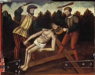 | Keywords: MCC-42054 Veelluik met het martelaarschap van de H. Theodosia (63).jpg Artwork nl Anonymous Gelre nl Middenstuk 1 Theodosia verzoekt toelating tot de gevangenis Rechtsboven een engel met banderol waarop de tekst Ghi sijt verhoert die geve die ghi do bidt heb ick gevestigt mit mijnen gelt die martelie te liden 2 Theodosia wordt bij de magistraat ter verantwoording geroepen Op het tekstbord Desen s alch sal ick mitter hulpen des heren voer s en 3 Theodosia ™s marteling aan de hefboom Op het tekstbord Ic ben bereyd dinc voer iezus christo te liden 4a Theodosia aan de schandpaal 4b Theodosia ™s ledematen worden uitgerekt 5 Allegorische voorstelling Christus aan het kruis met het offerlam op zijn schouders; onder het kruis negen schapen Op de voorgrond links een non rechts koning David met een gouden kroon op zijn hoofd en een herdersstaf met schep in beide handen die hij naar de non uitsteekt; tussen hen in ligt een harp Op het tekstbord suster hoede die scapen dier gedacten in die minne des brudegoms iesus opten berch caluarie 6a Theodosia uit het water gered door twee engelen 6b Vijf nonnen en een vrouw in wereldse kledij bezoeken Theodosia in de gevangenis Op het tekstbord min medes elen in cro Christo den enge w ech Het opschrift op de lijst onder de voorstelling is onleesbaar 7 Theodosia voor de wilde dieren geworpen Op het tekstbord nu suldi bekennen hoe vol si vermogen die god mit pueren herten minnen 8 Onthoofding van Theodosia Op het tekstbord dat ic inren tiit des vreden heb vercregen dat sal ic inden striit nie verliesen 9a Verschijning van Theodosia aan haar ouders Op het tekstbord sieh hoe soet die glorie ist daer du mi af beroeven wolste 9b Begrafenis van Theodosia Een zwevende engel met banderol waarop si heft nu salighe vrocht Aan weerszijden van deze taferelen zijn vrouwelijke heiligen afgebeeld steeds twee aan twee met tussen hen in een geknielde non Op de eerste voorstelling links in plaats van een vrouwelijke heilige Maria met kind Links 10a Madonna op de maansikkel en Fides Opschriften / fides 10b Caritas en Spes Opschriften niet leesbaar 11a Agatha en Dorothea Opschriften aghata / doratea 11b Apollonia met attribuut van Agatha tang waarin in plaats van een tand een borst is geklemd en Euphrosia Opschriften appolonia / effrosia 12a Anatolia en Christina Opschriften anatolia / 12b Victoria en Sophia Opschriften victoria / sophia Rechts 13a Margaretha en Gertrudis Opschriften a gretha / gertrudis 13b Ursula en Walburga Opschriften ursula / 14a Catharina en Barbara Opschriften katrina / barbara 14b Agnes en Prisca Opschriften agneta / priska 15a Cecilia en Cunera Opschriften cecilia / cunera 15b Lucia en Clara Opschriften lucia / clara Binnenzijde linkerluiken 16 Kruisdraging met Veronica en Simon van Cyrene 17 Doornenkroning Rechts een als priester geklede heilige met een kelk in de hand en een knielende non 18 Geseling Rechts een H Bisschop 19 Christus in de Hof van Olijven en de stigmatisatie van de Franciscus 20 Besnijdenis Rechts een reguliere kanunnik en een geknielde vrouw in 16de-eeuwse kledij met de attributen van de H Goedele een lantaarn geflankeerd door een engel met een brandende kaars en een duivel met een blaasbalg; daaronder het opschrift gudila 21 Ontkleding van Christus Rechts een heilige met een boek en een ladder 22 Kruisnageling Rechts de apostel Thomas 23 Christus aan het kruis met Maria Johannes en de drie vrouwen Rechts Antonius 24 Bewening Rechts de apostel Paulus en twee geknielde nonnen 25 Christus treedt de wijnpers Links Augustinus rechts een reguliere kanunnik Binnenzijde rechterluiken 26 Aanbidding der koningen 27 Geboorte van Christus Opschrift gloria in excelsis 28a Visitatie 28b Vier nonnen knielend voor een altaar waarop een drieluik met de Kruisiging Achter hen een priester Boven diens hoofd h ia Rechts daarvan een banderol met eenregelige tekst van een lied adv i g i I Fi Filius dn domini 29 Annunciatie Opschrift ave gratia plena 30 Genadestoel Rechtsonder op de voorgrond knielt een non Op het tekstbord god die alle creatueren gescapen heft en ons mit sin dierbaren bloet verlost heft hi wil ock sin gracie geuen ge eit v an der oude naam van de stichtster-non 31 Christus verschijnt aan Maria 32 Hemelvaart van Christus 33 Kroning van Maria 34 Allegorische voorstelling God de Vader gezeten op een troon met op de trappen die naar de troon voeren links de vijf wijze rechts de vijf dwaze maagden; in het midden een engel boven de hellemond met drie verdoemden Op de banderol in de linkerhand van de engel Gae t of Myt ghi vermadi vermaledijden ; op de banderol in zijn rechterhand coemt ghi gebenedide Op het tekstbord bij de wijze maagden gaet tot der gene daer se te coop is Op het tekstbord bij de dwaze maagden geft ons den olie vor ons lamp Op de banderol aan de onderzijde van de voorstelling rick der hemelen sal worden all fiere maechden Buitenzijde linkerluiken Nr 35 36 en 40 t/m 44 zijn gewijd aan de zeven vallen van Christus De voorstellingen zijn zeer verwant aan zeven houtsneden met dit thema gedrukt op één blad getiteld ˜O mensch betracht dy siben vell Christi und dy siben herzenlaydt Marie ™ Wenen Albertina inv nr 1930-70 Zuid-Duitsland ca 1480; zie Marrow 1979 p 82 89 100 106 131 170 pl VIII 35 Christus ™ val voor de kruisnageling zesde val 36 Kruisoprichting zevende val 37 Allegorische voorstelling Christus als Man van Smarten en gebonden aan de geselpaal houdt een rood koord vast dat verbonden is met een knielende non Tekstrol Christus o dochter vollighet my want ic gepassijt bin voor di wilt mij u hert geven om ewich te leuen Tekstrol non here ic offer u myn hert nu ende inder ewicheit Achter de non zeven kleinere opschriften verwijzend naar zeven deugden elk voorafgegaan door een hand met een geselroede waarvan de eerste en de derde onleesbaar zijn 2 die mel it mildheid ; 4 gehoorsamheijt; 5 wakinge; 6 silencia ; 7 arheyt waarheid 38 Allegorische voorstelling In een ommuurde tuin slaat Christus met een hamer o
