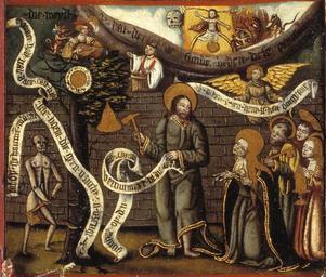 | Keywords: MCC-42054 Veelluik met het martelaarschap van de H. Theodosia (66).jpg Artwork nl Anonymous Gelre nl Middenstuk 1 Theodosia verzoekt toelating tot de gevangenis Rechtsboven een engel met banderol waarop de tekst Ghi sijt verhoert die geve die ghi do bidt heb ick gevestigt mit mijnen gelt die martelie te liden 2 Theodosia wordt bij de magistraat ter verantwoording geroepen Op het tekstbord Desen s alch sal ick mitter hulpen des heren voer s en 3 Theodosia ™s marteling aan de hefboom Op het tekstbord Ic ben bereyd dinc voer iezus christo te liden 4a Theodosia aan de schandpaal 4b Theodosia ™s ledematen worden uitgerekt 5 Allegorische voorstelling Christus aan het kruis met het offerlam op zijn schouders; onder het kruis negen schapen Op de voorgrond links een non rechts koning David met een gouden kroon op zijn hoofd en een herdersstaf met schep in beide handen die hij naar de non uitsteekt; tussen hen in ligt een harp Op het tekstbord suster hoede die scapen dier gedacten in die minne des brudegoms iesus opten berch caluarie 6a Theodosia uit het water gered door twee engelen 6b Vijf nonnen en een vrouw in wereldse kledij bezoeken Theodosia in de gevangenis Op het tekstbord min medes elen in cro Christo den enge w ech Het opschrift op de lijst onder de voorstelling is onleesbaar 7 Theodosia voor de wilde dieren geworpen Op het tekstbord nu suldi bekennen hoe vol si vermogen die god mit pueren herten minnen 8 Onthoofding van Theodosia Op het tekstbord dat ic inren tiit des vreden heb vercregen dat sal ic inden striit nie verliesen 9a Verschijning van Theodosia aan haar ouders Op het tekstbord sieh hoe soet die glorie ist daer du mi af beroeven wolste 9b Begrafenis van Theodosia Een zwevende engel met banderol waarop si heft nu salighe vrocht Aan weerszijden van deze taferelen zijn vrouwelijke heiligen afgebeeld steeds twee aan twee met tussen hen in een geknielde non Op de eerste voorstelling links in plaats van een vrouwelijke heilige Maria met kind Links 10a Madonna op de maansikkel en Fides Opschriften / fides 10b Caritas en Spes Opschriften niet leesbaar 11a Agatha en Dorothea Opschriften aghata / doratea 11b Apollonia met attribuut van Agatha tang waarin in plaats van een tand een borst is geklemd en Euphrosia Opschriften appolonia / effrosia 12a Anatolia en Christina Opschriften anatolia / 12b Victoria en Sophia Opschriften victoria / sophia Rechts 13a Margaretha en Gertrudis Opschriften a gretha / gertrudis 13b Ursula en Walburga Opschriften ursula / 14a Catharina en Barbara Opschriften katrina / barbara 14b Agnes en Prisca Opschriften agneta / priska 15a Cecilia en Cunera Opschriften cecilia / cunera 15b Lucia en Clara Opschriften lucia / clara Binnenzijde linkerluiken 16 Kruisdraging met Veronica en Simon van Cyrene 17 Doornenkroning Rechts een als priester geklede heilige met een kelk in de hand en een knielende non 18 Geseling Rechts een H Bisschop 19 Christus in de Hof van Olijven en de stigmatisatie van de Franciscus 20 Besnijdenis Rechts een reguliere kanunnik en een geknielde vrouw in 16de-eeuwse kledij met de attributen van de H Goedele een lantaarn geflankeerd door een engel met een brandende kaars en een duivel met een blaasbalg; daaronder het opschrift gudila 21 Ontkleding van Christus Rechts een heilige met een boek en een ladder 22 Kruisnageling Rechts de apostel Thomas 23 Christus aan het kruis met Maria Johannes en de drie vrouwen Rechts Antonius 24 Bewening Rechts de apostel Paulus en twee geknielde nonnen 25 Christus treedt de wijnpers Links Augustinus rechts een reguliere kanunnik Binnenzijde rechterluiken 26 Aanbidding der koningen 27 Geboorte van Christus Opschrift gloria in excelsis 28a Visitatie 28b Vier nonnen knielend voor een altaar waarop een drieluik met de Kruisiging Achter hen een priester Boven diens hoofd h ia Rechts daarvan een banderol met eenregelige tekst van een lied adv i g i I Fi Filius dn domini 29 Annunciatie Opschrift ave gratia plena 30 Genadestoel Rechtsonder op de voorgrond knielt een non Op het tekstbord god die alle creatueren gescapen heft en ons mit sin dierbaren bloet verlost heft hi wil ock sin gracie geuen ge eit v an der oude naam van de stichtster-non 31 Christus verschijnt aan Maria 32 Hemelvaart van Christus 33 Kroning van Maria 34 Allegorische voorstelling God de Vader gezeten op een troon met op de trappen die naar de troon voeren links de vijf wijze rechts de vijf dwaze maagden; in het midden een engel boven de hellemond met drie verdoemden Op de banderol in de linkerhand van de engel Gae t of Myt ghi vermadi vermaledijden ; op de banderol in zijn rechterhand coemt ghi gebenedide Op het tekstbord bij de wijze maagden gaet tot der gene daer se te coop is Op het tekstbord bij de dwaze maagden geft ons den olie vor ons lamp Op de banderol aan de onderzijde van de voorstelling rick der hemelen sal worden all fiere maechden Buitenzijde linkerluiken Nr 35 36 en 40 t/m 44 zijn gewijd aan de zeven vallen van Christus De voorstellingen zijn zeer verwant aan zeven houtsneden met dit thema gedrukt op één blad getiteld ˜O mensch betracht dy siben vell Christi und dy siben herzenlaydt Marie ™ Wenen Albertina inv nr 1930-70 Zuid-Duitsland ca 1480; zie Marrow 1979 p 82 89 100 106 131 170 pl VIII 35 Christus ™ val voor de kruisnageling zesde val 36 Kruisoprichting zevende val 37 Allegorische voorstelling Christus als Man van Smarten en gebonden aan de geselpaal houdt een rood koord vast dat verbonden is met een knielende non Tekstrol Christus o dochter vollighet my want ic gepassijt bin voor di wilt mij u hert geven om ewich te leuen Tekstrol non here ic offer u myn hert nu ende inder ewicheit Achter de non zeven kleinere opschriften verwijzend naar zeven deugden elk voorafgegaan door een hand met een geselroede waarvan de eerste en de derde onleesbaar zijn 2 die mel it mildheid ; 4 gehoorsamheijt; 5 wakinge; 6 silencia ; 7 arheyt waarheid 38 Allegorische voorstelling In een ommuurde tuin slaat Christus met een hamer o
