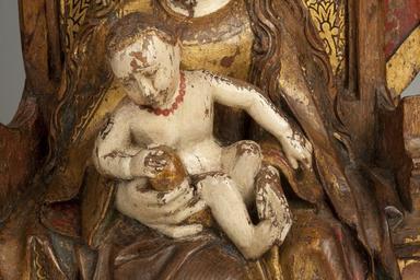 | Keywords: MCC-42227 Anna-te-Drieën (6).tif Artwork nl Anonymous Noord-Nederland Anonymous Utrecht nl Anna buigt zich over de rugleuning van de zetel waarop Maria is gezeten die het naakte kind op haar schoot houdt Anna draagt in haar linkerhand een opengeslagen boek Haar rechterhand houdt ze op Maria's rechterschouder Haar hoog opgetrokken linkerbeen staat op een bankje dat van achter de zetel zichtbaar is Het Christuskind laat zijn rechterhand rusten op de appel die Maria in haar rechterhand draagt Het heeft zich iets naar links gewend en laat zijn linkerhand rusten op de linkerarm van Maria Maria ondersteunt met haar linkerhand de opgetrokken beentjes van het kind en houdt zijn rechtervoetje vast Opvallend is de sterk gebogen stand van Maria's rechterbeen waarvan de knie naar binnen is gewend Haar voet lijkt uit haar slof te schieten Anna met hoofd- en kindoek draagt een lang kleed en een over het hoofd geslagen mantel Maria is gekleed in een lang gewaad en mantel en heeft een bloemenkrans om het hoofd Maria en Anna dragen sloffen met ronde neuzen Het kind heeft een geschilderde bloedkoralen ketting om de hals waaraan vroeger een kruisje eveneens geschilderd hing De zetel heeft een hoge brede rugleuning met verdiept middenveld omlijst door een geprofileerde rand en op de bovenhoeken uitkragende versieringen in de vorm van zeer gestileerde pinakels De lage armleuningen zijn aan de bovenzijde hol en aan de voorzijde voorzien van een bolprofiel waaronder een kwarthol en enkele rechte profielen Links en rechts in de voorzijde onder de leuningen een blindnis met twee toten Het bankje achter de zetel heeft een geprofileerde bovenrand De zetel is geplaatst op een grond met smalle parallelle groeven Het beeld staat op een losse rechthoekige geprofileerde plint waarin vier gaten met resten van de nagels voor de bevestiging aanwezig zijn De onderzijde van de plint is uitgehold Polychromie De polychromie is aangebracht op een dunne witte grond de vergulding op een geel-bruine bolus Het incarnaat is bijna wit met roze blossen Helderrode lippen Wimpers rimpels en plooien zijn heel gedetailleerd weergegeven in rose-bruine tinten Bij het kind zijn de details van de oren roze De vingernagels zijn wit met een rode rand Bij Maria en Anna zijn nog bruine irissen aanwezig De wenkbrauwen zijn bruin Het incarnaat van de gezichten wordt begrensd door een roze lijn; zo ook de halspartijen De haren van Maria en het kind zijn verguld Anna's kleed heeft een polimentvergulding De binnenkant van het kleed ter hoogte van de handen is rood met groefjes om bont te suggereren Langs de zoom een dubbele rode lijn Anna's mantel is rood met gouden rand en een zwarte bies tussen het rood en het goud De binnenkant van de mantel is azurietblauw op een zwarte grond De kindoek heeft een dubbele roze bies De doek zelf is wit of grijzig resten blauw pigment Het boek heeft een zwarte band witte bladen met zwarte letters rode beginkapitalen en pargraaftekens en is goud op snee De marges van de tekst zijn aangegeven met een rode lijn Maria heeft een goudkleurig gewaad met roodversierd boord en een brede versierde rand langs de mouwen Aan de binnenkant van de mouwen links groen en rechts groen en blauw De buitenzijde van de blauwe mantel heeft brede gouden boorden waarlangs een gouden lijn; erboven een schulpmotief met op elke punt drie stipjes waardoor een gestileerd bloemmotief ontstaat De binnenkant van de mantel is rood met een smalle gouden bies met zwarte belijning De bloemen van de krans hebben vergulde hartjes en vertonen verder sporen rood De appel vertoont sporen van vergulding en rood onderaan bij de hand van Maria en bij de vingers van het kind Het schoeisel is zwart de binnenkant van Maria's slof is geel haar kous rood Het middenveld van de leuning van de zetel vertoont een brokaatmotief met donkerbruine tot groenige lijnen op goud De spaarvelden in de blindnissen zijn roze de randen van de blindnissen verguld De profilering daarboven en onder afwisselend goud en roze De plint en de zijkanten van de zetel zijn bruin-rood de binnenzijde van de armleuningen roze-rood en de profielen goudkleurig Het zitgedeelte is roze De omlijsting van de rugleuning is gemarmerd in bruinige en zwarte en grijs-roodachtige tinten De knoppen boven op de rugleuningprofilering afwisselend goud en rose Over het algemeen zijn de terugliggende profielen roze en de uitspringende profielen verguld Het bankje van Anna lijkt rood-bruin Op de grond nog een klein restje geel-groen Op de achterzijde is het rood van Anna's mantel op haar hoofd en schouders en op haar linkerbeen doorgezet Techniek De achterzijde is vrij grof afgevlakt De kern ligt links in het werkblok Op het standvlak parallelle gutssporen Een kleine vierkant gaatje bovenin het hoofd van Anna In de rugleuning aan de voorzijde een noest Staat Afgebroken een stukje uit de bloemenkrans; het rechterbolprofiel van de stoelleuning; een hoek van het profiel daaronder; enkele delen uit de grond vooral links wat grotere stukken Scheurvorming vanuit de kern Een grote scheur in de voorzijde is dichtgezet met hout en kunsthars Een gaatje in de rug en twee moderne schroefgaten In het standvlak drie vierkante spijkergaten waarvan twee met resten van spijkers en een onregelmatig ondiep gat De polychromie is over de gehele oppervlakte beschadigd en gesleten vooral op het kleed van Maria between 1495 1504 nl eikenhout verf Size 51 0 29 0 cm nl Hoogte 51 0cm Breedte 29 0cm Diepte 18 0cm Institution Museum Catharijneconvent object history exhibition history credit line nl Foto Museum Catharijneconvent Utrecht foto Ruben de Heer Reproduction title nl Detail accession number Object number 42227 Inventory number ABM bh00499 place of creation https //www catharijneconvent nl/adlib/42227/ View this work on the website of Museum Catharijneconvent Museum Catharijneconvent Cc-zero <gallery> File MCC-42227_Anna-te-Drieën_ 6 tif File MCC-42227_Anna-te-Drieën_ 1 tif File MCC-42227_Anna-te-Drieën_ 11 tif File MC