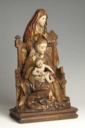 | Keywords: MCC-42227 Anna-te-Drieën (3).tif Artwork nl Anonymous Noord-Nederland Anonymous Utrecht nl Anna buigt zich over de rugleuning van de zetel waarop Maria is gezeten die het naakte kind op haar schoot houdt Anna draagt in haar linkerhand een opengeslagen boek Haar rechterhand houdt ze op Maria's rechterschouder Haar hoog opgetrokken linkerbeen staat op een bankje dat van achter de zetel zichtbaar is Het Christuskind laat zijn rechterhand rusten op de appel die Maria in haar rechterhand draagt Het heeft zich iets naar links gewend en laat zijn linkerhand rusten op de linkerarm van Maria Maria ondersteunt met haar linkerhand de opgetrokken beentjes van het kind en houdt zijn rechtervoetje vast Opvallend is de sterk gebogen stand van Maria's rechterbeen waarvan de knie naar binnen is gewend Haar voet lijkt uit haar slof te schieten Anna met hoofd- en kindoek draagt een lang kleed en een over het hoofd geslagen mantel Maria is gekleed in een lang gewaad en mantel en heeft een bloemenkrans om het hoofd Maria en Anna dragen sloffen met ronde neuzen Het kind heeft een geschilderde bloedkoralen ketting om de hals waaraan vroeger een kruisje eveneens geschilderd hing De zetel heeft een hoge brede rugleuning met verdiept middenveld omlijst door een geprofileerde rand en op de bovenhoeken uitkragende versieringen in de vorm van zeer gestileerde pinakels De lage armleuningen zijn aan de bovenzijde hol en aan de voorzijde voorzien van een bolprofiel waaronder een kwarthol en enkele rechte profielen Links en rechts in de voorzijde onder de leuningen een blindnis met twee toten Het bankje achter de zetel heeft een geprofileerde bovenrand De zetel is geplaatst op een grond met smalle parallelle groeven Het beeld staat op een losse rechthoekige geprofileerde plint waarin vier gaten met resten van de nagels voor de bevestiging aanwezig zijn De onderzijde van de plint is uitgehold Polychromie De polychromie is aangebracht op een dunne witte grond de vergulding op een geel-bruine bolus Het incarnaat is bijna wit met roze blossen Helderrode lippen Wimpers rimpels en plooien zijn heel gedetailleerd weergegeven in rose-bruine tinten Bij het kind zijn de details van de oren roze De vingernagels zijn wit met een rode rand Bij Maria en Anna zijn nog bruine irissen aanwezig De wenkbrauwen zijn bruin Het incarnaat van de gezichten wordt begrensd door een roze lijn; zo ook de halspartijen De haren van Maria en het kind zijn verguld Anna's kleed heeft een polimentvergulding De binnenkant van het kleed ter hoogte van de handen is rood met groefjes om bont te suggereren Langs de zoom een dubbele rode lijn Anna's mantel is rood met gouden rand en een zwarte bies tussen het rood en het goud De binnenkant van de mantel is azurietblauw op een zwarte grond De kindoek heeft een dubbele roze bies De doek zelf is wit of grijzig resten blauw pigment Het boek heeft een zwarte band witte bladen met zwarte letters rode beginkapitalen en pargraaftekens en is goud op snee De marges van de tekst zijn aangegeven met een rode lijn Maria heeft een goudkleurig gewaad met roodversierd boord en een brede versierde rand langs de mouwen Aan de binnenkant van de mouwen links groen en rechts groen en blauw De buitenzijde van de blauwe mantel heeft brede gouden boorden waarlangs een gouden lijn; erboven een schulpmotief met op elke punt drie stipjes waardoor een gestileerd bloemmotief ontstaat De binnenkant van de mantel is rood met een smalle gouden bies met zwarte belijning De bloemen van de krans hebben vergulde hartjes en vertonen verder sporen rood De appel vertoont sporen van vergulding en rood onderaan bij de hand van Maria en bij de vingers van het kind Het schoeisel is zwart de binnenkant van Maria's slof is geel haar kous rood Het middenveld van de leuning van de zetel vertoont een brokaatmotief met donkerbruine tot groenige lijnen op goud De spaarvelden in de blindnissen zijn roze de randen van de blindnissen verguld De profilering daarboven en onder afwisselend goud en roze De plint en de zijkanten van de zetel zijn bruin-rood de binnenzijde van de armleuningen roze-rood en de profielen goudkleurig Het zitgedeelte is roze De omlijsting van de rugleuning is gemarmerd in bruinige en zwarte en grijs-roodachtige tinten De knoppen boven op de rugleuningprofilering afwisselend goud en rose Over het algemeen zijn de terugliggende profielen roze en de uitspringende profielen verguld Het bankje van Anna lijkt rood-bruin Op de grond nog een klein restje geel-groen Op de achterzijde is het rood van Anna's mantel op haar hoofd en schouders en op haar linkerbeen doorgezet Techniek De achterzijde is vrij grof afgevlakt De kern ligt links in het werkblok Op het standvlak parallelle gutssporen Een kleine vierkant gaatje bovenin het hoofd van Anna In de rugleuning aan de voorzijde een noest Staat Afgebroken een stukje uit de bloemenkrans; het rechterbolprofiel van de stoelleuning; een hoek van het profiel daaronder; enkele delen uit de grond vooral links wat grotere stukken Scheurvorming vanuit de kern Een grote scheur in de voorzijde is dichtgezet met hout en kunsthars Een gaatje in de rug en twee moderne schroefgaten In het standvlak drie vierkante spijkergaten waarvan twee met resten van spijkers en een onregelmatig ondiep gat De polychromie is over de gehele oppervlakte beschadigd en gesleten vooral op het kleed van Maria between 1495 1504 nl eikenhout verf Size 51 0 29 0 cm nl Hoogte 51 0cm Breedte 29 0cm Diepte 18 0cm Institution Museum Catharijneconvent object history exhibition history credit line nl Foto Museum Catharijneconvent Utrecht foto Ruben de Heer accession number Object number 42227 Inventory number ABM bh00499 place of creation https //www catharijneconvent nl/adlib/42227/ View this work on the website of Museum Catharijneconvent Museum Catharijneconvent Cc-zero <gallery> File MCC-42227_Anna-te-Drieën_ 6 tif File MCC-42227_Anna-te-Drieën_ 1 tif File MCC-42227_Anna-te-Drieën_ 11 tif File MCC-42227_Anna-te-Drieën_ 3 ti