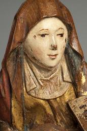| Keywords: MCC-42227 Anna-te-Drieën (9).tif Artwork nl Anonymous Noord-Nederland Anonymous Utrecht nl Anna buigt zich over de rugleuning van de zetel waarop Maria is gezeten die het naakte kind op haar schoot houdt Anna draagt in haar linkerhand een opengeslagen boek Haar rechterhand houdt ze op Maria's rechterschouder Haar hoog opgetrokken linkerbeen staat op een bankje dat van achter de zetel zichtbaar is Het Christuskind laat zijn rechterhand rusten op de appel die Maria in haar rechterhand draagt Het heeft zich iets naar links gewend en laat zijn linkerhand rusten op de linkerarm van Maria Maria ondersteunt met haar linkerhand de opgetrokken beentjes van het kind en houdt zijn rechtervoetje vast Opvallend is de sterk gebogen stand van Maria's rechterbeen waarvan de knie naar binnen is gewend Haar voet lijkt uit haar slof te schieten Anna met hoofd- en kindoek draagt een lang kleed en een over het hoofd geslagen mantel Maria is gekleed in een lang gewaad en mantel en heeft een bloemenkrans om het hoofd Maria en Anna dragen sloffen met ronde neuzen Het kind heeft een geschilderde bloedkoralen ketting om de hals waaraan vroeger een kruisje eveneens geschilderd hing De zetel heeft een hoge brede rugleuning met verdiept middenveld omlijst door een geprofileerde rand en op de bovenhoeken uitkragende versieringen in de vorm van zeer gestileerde pinakels De lage armleuningen zijn aan de bovenzijde hol en aan de voorzijde voorzien van een bolprofiel waaronder een kwarthol en enkele rechte profielen Links en rechts in de voorzijde onder de leuningen een blindnis met twee toten Het bankje achter de zetel heeft een geprofileerde bovenrand De zetel is geplaatst op een grond met smalle parallelle groeven Het beeld staat op een losse rechthoekige geprofileerde plint waarin vier gaten met resten van de nagels voor de bevestiging aanwezig zijn De onderzijde van de plint is uitgehold Polychromie De polychromie is aangebracht op een dunne witte grond de vergulding op een geel-bruine bolus Het incarnaat is bijna wit met roze blossen Helderrode lippen Wimpers rimpels en plooien zijn heel gedetailleerd weergegeven in rose-bruine tinten Bij het kind zijn de details van de oren roze De vingernagels zijn wit met een rode rand Bij Maria en Anna zijn nog bruine irissen aanwezig De wenkbrauwen zijn bruin Het incarnaat van de gezichten wordt begrensd door een roze lijn; zo ook de halspartijen De haren van Maria en het kind zijn verguld Anna's kleed heeft een polimentvergulding De binnenkant van het kleed ter hoogte van de handen is rood met groefjes om bont te suggereren Langs de zoom een dubbele rode lijn Anna's mantel is rood met gouden rand en een zwarte bies tussen het rood en het goud De binnenkant van de mantel is azurietblauw op een zwarte grond De kindoek heeft een dubbele roze bies De doek zelf is wit of grijzig resten blauw pigment Het boek heeft een zwarte band witte bladen met zwarte letters rode beginkapitalen en pargraaftekens en is goud op snee De marges van de tekst zijn aangegeven met een rode lijn Maria heeft een goudkleurig gewaad met roodversierd boord en een brede versierde rand langs de mouwen Aan de binnenkant van de mouwen links groen en rechts groen en blauw De buitenzijde van de blauwe mantel heeft brede gouden boorden waarlangs een gouden lijn; erboven een schulpmotief met op elke punt drie stipjes waardoor een gestileerd bloemmotief ontstaat De binnenkant van de mantel is rood met een smalle gouden bies met zwarte belijning De bloemen van de krans hebben vergulde hartjes en vertonen verder sporen rood De appel vertoont sporen van vergulding en rood onderaan bij de hand van Maria en bij de vingers van het kind Het schoeisel is zwart de binnenkant van Maria's slof is geel haar kous rood Het middenveld van de leuning van de zetel vertoont een brokaatmotief met donkerbruine tot groenige lijnen op goud De spaarvelden in de blindnissen zijn roze de randen van de blindnissen verguld De profilering daarboven en onder afwisselend goud en roze De plint en de zijkanten van de zetel zijn bruin-rood de binnenzijde van de armleuningen roze-rood en de profielen goudkleurig Het zitgedeelte is roze De omlijsting van de rugleuning is gemarmerd in bruinige en zwarte en grijs-roodachtige tinten De knoppen boven op de rugleuningprofilering afwisselend goud en rose Over het algemeen zijn de terugliggende profielen roze en de uitspringende profielen verguld Het bankje van Anna lijkt rood-bruin Op de grond nog een klein restje geel-groen Op de achterzijde is het rood van Anna's mantel op haar hoofd en schouders en op haar linkerbeen doorgezet Techniek De achterzijde is vrij grof afgevlakt De kern ligt links in het werkblok Op het standvlak parallelle gutssporen Een kleine vierkant gaatje bovenin het hoofd van Anna In de rugleuning aan de voorzijde een noest Staat Afgebroken een stukje uit de bloemenkrans; het rechterbolprofiel van de stoelleuning; een hoek van het profiel daaronder; enkele delen uit de grond vooral links wat grotere stukken Scheurvorming vanuit de kern Een grote scheur in de voorzijde is dichtgezet met hout en kunsthars Een gaatje in de rug en twee moderne schroefgaten In het standvlak drie vierkante spijkergaten waarvan twee met resten van spijkers en een onregelmatig ondiep gat De polychromie is over de gehele oppervlakte beschadigd en gesleten vooral op het kleed van Maria between 1495 1504 nl eikenhout verf Size 51 0 29 0 cm nl Hoogte 51 0cm Breedte 29 0cm Diepte 18 0cm Institution Museum Catharijneconvent object history exhibition history credit line nl Foto Museum Catharijneconvent Utrecht foto Ruben de Heer Reproduction title nl Detail accession number Object number 42227 Inventory number ABM bh00499 place of creation https //www catharijneconvent nl/adlib/42227/ View this work on the website of Museum Catharijneconvent Museum Catharijneconvent Cc-zero <gallery> File MCC-42227_Anna-te-Drieën_ 6 tif File MCC-42227_Anna-te-Drieën_ 1 tif File MCC-42227_Anna-te-Drieën_ 11 tif File MC