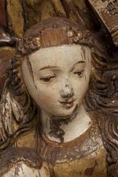 | Keywords: MCC-42227 Anna-te-Drieën (8).tif Artwork nl Anonymous Noord-Nederland Anonymous Utrecht nl Anna buigt zich over de rugleuning van de zetel waarop Maria is gezeten die het naakte kind op haar schoot houdt Anna draagt in haar linkerhand een opengeslagen boek Haar rechterhand houdt ze op Maria's rechterschouder Haar hoog opgetrokken linkerbeen staat op een bankje dat van achter de zetel zichtbaar is Het Christuskind laat zijn rechterhand rusten op de appel die Maria in haar rechterhand draagt Het heeft zich iets naar links gewend en laat zijn linkerhand rusten op de linkerarm van Maria Maria ondersteunt met haar linkerhand de opgetrokken beentjes van het kind en houdt zijn rechtervoetje vast Opvallend is de sterk gebogen stand van Maria's rechterbeen waarvan de knie naar binnen is gewend Haar voet lijkt uit haar slof te schieten Anna met hoofd- en kindoek draagt een lang kleed en een over het hoofd geslagen mantel Maria is gekleed in een lang gewaad en mantel en heeft een bloemenkrans om het hoofd Maria en Anna dragen sloffen met ronde neuzen Het kind heeft een geschilderde bloedkoralen ketting om de hals waaraan vroeger een kruisje eveneens geschilderd hing De zetel heeft een hoge brede rugleuning met verdiept middenveld omlijst door een geprofileerde rand en op de bovenhoeken uitkragende versieringen in de vorm van zeer gestileerde pinakels De lage armleuningen zijn aan de bovenzijde hol en aan de voorzijde voorzien van een bolprofiel waaronder een kwarthol en enkele rechte profielen Links en rechts in de voorzijde onder de leuningen een blindnis met twee toten Het bankje achter de zetel heeft een geprofileerde bovenrand De zetel is geplaatst op een grond met smalle parallelle groeven Het beeld staat op een losse rechthoekige geprofileerde plint waarin vier gaten met resten van de nagels voor de bevestiging aanwezig zijn De onderzijde van de plint is uitgehold Polychromie De polychromie is aangebracht op een dunne witte grond de vergulding op een geel-bruine bolus Het incarnaat is bijna wit met roze blossen Helderrode lippen Wimpers rimpels en plooien zijn heel gedetailleerd weergegeven in rose-bruine tinten Bij het kind zijn de details van de oren roze De vingernagels zijn wit met een rode rand Bij Maria en Anna zijn nog bruine irissen aanwezig De wenkbrauwen zijn bruin Het incarnaat van de gezichten wordt begrensd door een roze lijn; zo ook de halspartijen De haren van Maria en het kind zijn verguld Anna's kleed heeft een polimentvergulding De binnenkant van het kleed ter hoogte van de handen is rood met groefjes om bont te suggereren Langs de zoom een dubbele rode lijn Anna's mantel is rood met gouden rand en een zwarte bies tussen het rood en het goud De binnenkant van de mantel is azurietblauw op een zwarte grond De kindoek heeft een dubbele roze bies De doek zelf is wit of grijzig resten blauw pigment Het boek heeft een zwarte band witte bladen met zwarte letters rode beginkapitalen en pargraaftekens en is goud op snee De marges van de tekst zijn aangegeven met een rode lijn Maria heeft een goudkleurig gewaad met roodversierd boord en een brede versierde rand langs de mouwen Aan de binnenkant van de mouwen links groen en rechts groen en blauw De buitenzijde van de blauwe mantel heeft brede gouden boorden waarlangs een gouden lijn; erboven een schulpmotief met op elke punt drie stipjes waardoor een gestileerd bloemmotief ontstaat De binnenkant van de mantel is rood met een smalle gouden bies met zwarte belijning De bloemen van de krans hebben vergulde hartjes en vertonen verder sporen rood De appel vertoont sporen van vergulding en rood onderaan bij de hand van Maria en bij de vingers van het kind Het schoeisel is zwart de binnenkant van Maria's slof is geel haar kous rood Het middenveld van de leuning van de zetel vertoont een brokaatmotief met donkerbruine tot groenige lijnen op goud De spaarvelden in de blindnissen zijn roze de randen van de blindnissen verguld De profilering daarboven en onder afwisselend goud en roze De plint en de zijkanten van de zetel zijn bruin-rood de binnenzijde van de armleuningen roze-rood en de profielen goudkleurig Het zitgedeelte is roze De omlijsting van de rugleuning is gemarmerd in bruinige en zwarte en grijs-roodachtige tinten De knoppen boven op de rugleuningprofilering afwisselend goud en rose Over het algemeen zijn de terugliggende profielen roze en de uitspringende profielen verguld Het bankje van Anna lijkt rood-bruin Op de grond nog een klein restje geel-groen Op de achterzijde is het rood van Anna's mantel op haar hoofd en schouders en op haar linkerbeen doorgezet Techniek De achterzijde is vrij grof afgevlakt De kern ligt links in het werkblok Op het standvlak parallelle gutssporen Een kleine vierkant gaatje bovenin het hoofd van Anna In de rugleuning aan de voorzijde een noest Staat Afgebroken een stukje uit de bloemenkrans; het rechterbolprofiel van de stoelleuning; een hoek van het profiel daaronder; enkele delen uit de grond vooral links wat grotere stukken Scheurvorming vanuit de kern Een grote scheur in de voorzijde is dichtgezet met hout en kunsthars Een gaatje in de rug en twee moderne schroefgaten In het standvlak drie vierkante spijkergaten waarvan twee met resten van spijkers en een onregelmatig ondiep gat De polychromie is over de gehele oppervlakte beschadigd en gesleten vooral op het kleed van Maria between 1495 1504 nl eikenhout verf Size 51 0 29 0 cm nl Hoogte 51 0cm Breedte 29 0cm Diepte 18 0cm Institution Museum Catharijneconvent object history exhibition history credit line nl Foto Museum Catharijneconvent Utrecht foto Ruben de Heer Reproduction title nl Detail accession number Object number 42227 Inventory number ABM bh00499 place of creation https //www catharijneconvent nl/adlib/42227/ View this work on the website of Museum Catharijneconvent Museum Catharijneconvent Cc-zero <gallery> File MCC-42227_Anna-te-Drieën_ 6 tif File MCC-42227_Anna-te-Drieën_ 1 tif File MCC-42227_Anna-te-Drieën_ 11 tif File MC