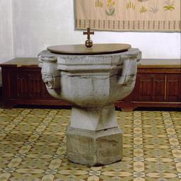 | Keywords: MCC-42291 Doopvont, achtzijdige kuip met sferische vlakken, vier verschillende maskers aan bovenzijde (2).tif Artwork nl Anonymous Maasland nl De doopvont bestaat uit een achtzijdige kuip met sferische vlakken; aan de bovenrand een profiel bestaande uit kwarthol staaf halfhol en een kleiner staafprofiel Vier van de acht vlakken dragen aan de bovenzijde een maskerkop die aan de bovenzijde vlak is en halfrond uitspringt ten opzichte van het vlak van de rand Beschrijving van de koppen van links naar rechts De eerste heeft een lang gelaat met hoge jukbeenderen van boven afgeplatte amandelvormige ogen met aangeduide pupil en iris waarboven veel ruimte een hoekige kin en een haakneus Hij laat breed grijnzend zijn gebit zien De overige drie hebben afgezien van de neus die bij deze koppen recht is met uitstaande neusvleugels dezelfde gelaatsvorm maar kijken ernstig en hebben een smalle mond met iets naar beneden gebogen mondhoeken De hoofdbedekking is bij alle koppen verschillend Bij alle varianten zijn de oren bedekt Het eerste gelaat is omgeven door een nauwsluitende hoofdbedekking de tweede kop draagt een zich naar boven versmallende hoed de derde een muts waarvan de punt naar voren hangt en de vierde heeft een aan de voorzijde afgeplatte ronde hoofdbedekking De uitholling van de kuip is half bol van vorm In de brede bovenrand van de kuip zijn in twee tegenover elkaar liggende zijden dookgaten te zien één rechthoekig gat van ca 4 5 x 3 cm één ovaal uitgesleten gat van 5 5 x 4 5 cm Aan één zijde in de rand een 10 cm brede ondiepe uitholling over de gehele breedte De doopvont staat op een 18 5 cm hoge tufstenen of kunststenen schacht die de overgang vormt naar een 29 5 cm hoge zeszijdige zandstenen voet De vlakken van schacht en voet zijn iets hol Techniek De binnenzijde van de vont is glad Op de bovenrand smalle evenwijdige beitelsporen Het oppervlak van de vont is bedekt met een vrij regelmatig patroon van ingehamerde ronde punten gebouchardeerd met uitzondering van de gezichten het holprofiel met de rand daarboven en de graten tussen de vlakken Het oppervlak van de schacht is afgewerkt met evenwijdige horizontale lijnen tandbeitel Staat Voet en schacht behoren niet bij de kuip De voet lijkt oud de schacht is modern Bij de vont wordt een modern rond eiken deksel gebruikt met in het midden een bol met kruis Het oorspronkelijke deksel ontbreekt Afgebroken vele kleine delen langs de randen langs een natuurlijke breuk die loopt ter hoogte van de profielrand en het bovenste deel van de gezichten Deze breuk loopt vrijwel rondom door de gehele vont behalve ter plaatse van de 10 cm brede uitholling in de rand In de breuk hier en daar invullingen Alle neuzen van de figuren zijn beschadigd De graten van de voet zijn beschadigd In de bovenrand een onregelmatig rechthoekige beschadiging Aan de binnenzijde van de vont kalkafzetting between 1400 1499 nl Naamse steen Size 91 0 80 0 cm nl Hoogte 91 0cm Breedte 80 0cm Diepte 79 5cm Institution Museum Catharijneconvent object history exhibition history credit line nl Foto Museum Catharijneconvent Utrecht foto Ruben de Heer accession number Object number 42291 Inventory number ABM bs00611 place of creation https //www catharijneconvent nl/adlib/42291/ View this work on the website of Museum Catharijneconvent Museum Catharijneconvent Cc-zero <gallery> File MCC-42291_Doopvont _achtzijdige_kuip_met_sferische_vlakken _vier_verschillende_maskers_aan_bovenzijde_ 2 tif File MCC-42291_Doopvont _achtzijdige_kuip_met_sferische_vlakken _vier_verschillende_maskers_aan_bovenzijde_ 3 jpg File MCC-42291_Doopvont _achtzijdige_kuip_met_sferische_vlakken _vier_verschillende_maskers_aan_bovenzijde_ 1 tif </gallery> Items from the Catharinazaal Uncategorized 2015 March 1 |