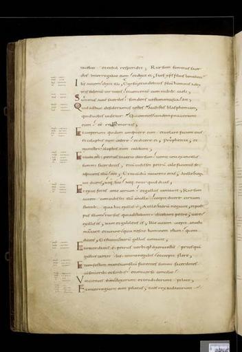 | Keywords: MCC-61050 Evangeliarium (Lebuïnuscodex) (134).jpg Artwork nl Anonymous Noordoost-Frankrijk Anonymous Rijnland Anonymous Maasland nl De kern van de boekband van de Lebuïnuscodex wordt gevormd door twee eikenhouten platten De rug en het achterplat zijn overtrokken met zeemleer Het voorplat is rijkelijk versierd met verguld zilversmeedwerk reliëfs van walrustand en verscheidene stenen De compositie van de bekleding van het voorplat wordt bepaald door een verguld zilveren filigraankruis Aan de uiteinden van de kruisarmen bevinden zich vierpassen met overhoeks vierkant eveneens met filigraan gedecoreerd Hiervan zijn er slechts twee bewaard gebleven en wel die aan de verticale kruisarmen Zij bevatten tevens nog de oorspronkelijke versiering bestaande uit een filigraanmedaillon met een pseudo-camee van respectievelijk een mannen- en een vrouwenhoofd in profiel Het snijpunt van het kruis wordt ingenomen door een ver vooruitstekend Bacchuskopje in chalcedoon te herkennen aan de kleine druiventrosjes in zijn haartooi Het kopje is gevat in een filigraanmedaillon welke op zijn beurt weer is geplaatst op een vierpas van filigraanwerk Op elk van de kruisarmen bevindt zich een ovale steen 'en cabochon' op een medaillon met filigraan Het filigraanwerk van kruis en sierstukken is in de vorm van visblazen In de ruimten tussen de kruisarmen zijn rechthoekige reliëfs van walrustand aangebracht met de vier evangelisten en hun symbool De reliëfs hebben de volgende afmetingen H 10 0 x B 5 5 cm Van links boven naar rechts onder betreft het Mattheus met de engel Johannes met de adelaar Marcus met de gevleugelde leeuw en Lucas met de gevleugelde os De figuren zijn paarsgewijs als elkaars spiegelbeeld ten opzichte van de middenas geplaatst Mattheus en Johannes zitten vrijwel geheel frontaal terwijl Marcus en Lucas meer in profiel zijn afgebeeld Qua opbouw verschillen de vier reliëfs nauwelijks van elkaar Binnen een rand van vierlobbige blaadjes verheffen zich twee zuilen met een basis een kapiteel en een dekplaat Hierop rust een rondboog geflankeerd door twee torens en afgedekt met een fronton dat boven Mattheus en Johannes boogvormig en boven Marcus en Lucas driehoekig is Onder deze overhuiving zitten de evangelisten gekleed in een lang gewaad en mantel met gekruiste benen aan een lessenaar hun blote voeten rustend op een bankje Allen zijn baardeloos en voorzien van een nimbus Voorts houden ze een pen in hun rechterhand terwijl hun linker op een boek ligt of gebarend is opgeheven Boven elk van de evangelisten verschijnt in de opening van het fronton zijn symbool met een spreukband Dit rijkelijk gedecoreerde middenveld wordt omlijst door sierbanden van verguld koper De opbouw van de sierlijsten is steeds dezelfde een opstaande smalle band die op regelmatige afstanden is voorzien van holten met aan weerszijden een brede strook voorzien van een gestanst motief Aan de lange zijden van de boekband bestaat het motief uit palmetten aan de korte zijden uit rozetten Van deze laatstgenoemde stroken ontbreekt steeds de buitenste rand Bij alle stroken met palmettenmotief wijzen de palmetten naar links met uitzondering van de buitenste strook rechtsboven die het motief in tegengestelde richting toont Verguld zilveren rozetten op de hoeken van het voorplat omgeven door een smalle rand van filigraanwerk met cirkelmotief en bekroond met een 'en cabochon' gezette steen completeren het geheel Van de rozet links onder ontbreekt de steen en is slechts de buitenste rand over Aan de voorzijde van de boekband bevinden zich nog de rudimenten van twee sluitingen between u'825' u'1000' u'1150' u'850' u'1199' u'1199' nl perkament eikenhout zilver goud koper walrustand chalcedoon glas leer Size 35 5 26 0 cm nl Hoogte 35 5cm Breedte 26 0cm Diepte 13 5cm Institution Museum Catharijneconvent object history exhibition history credit line nl Foto Museum Catharijneconvent Utrecht foto HetFotoAtelier Peter Rothengatter accession number Object number 61050 Inventory number ABM h1 place of creation https //www catharijneconvent nl/adlib/61050/ View this work on the website of Museum Catharijneconvent Museum Catharijneconvent Cc-zero <gallery> File MCC-61050_Evangeliarium_Lebuïnuscodex_ 11 jpg File MCC-61050_Evangeliarium_Lebuïnuscodex_ 172 jpg File MCC-61050_Evangeliarium_Lebuïnuscodex_ 212 jpg File MCC-61050_Evangeliarium_Lebuïnuscodex_ 61 jpg File MCC-61050_Evangeliarium_Lebuïnuscodex_ 12 jpg File MCC-61050_Evangeliarium_Lebuïnuscodex_ 213 jpg File MCC-61050_Evangeliarium_Lebuïnuscodex_ 56 jpg File MCC-61050_Evangeliarium_Lebuïnuscodex_ 232 jpg File MCC-61050_Evangeliarium_Lebuïnuscodex_ 93 jpg File MCC-61050_Evangeliarium_Lebuïnuscodex_ 99 jpg File MCC-61050_Evangeliarium_Lebuïnuscodex_ 184 jpg File MCC-61050_Evangeliarium_Lebuïnuscodex_ 64 jpg File MCC-61050_Evangeliarium_Lebuïnuscodex_ 299 jpg File MCC-61050_Evangeliarium_Lebuïnuscodex_ 86 jpg File MCC-61050_Evangeliarium_Lebuïnuscodex_ 260 jpg File MCC-61050_Evangeliarium_Lebuïnuscodex_ 159 jpg File MCC-61050_Evangeliarium_Lebuïnuscodex_ 247 jpg File MCC-61050_Evangeliarium_Lebuïnuscodex_ 180 jpg File MCC-61050_Evangeliarium_Lebuïnuscodex_ 121 jpg File MCC-61050_Evangeliarium_Lebuïnuscodex_ 315 jpg File MCC-61050_Evangeliarium_Lebuïnuscodex_ 284 jpg File MCC-61050_Evangeliarium_Lebuïnuscodex_ 33 jpg File MCC-61050_Evangeliarium_Lebuïnuscodex_ 44 jpg File MCC-61050_Evangeliarium_Lebuïnuscodex_ 258 jpg File MCC-61050_Evangeliarium_Lebuïnuscodex_ 237 jpg File MCC-61050_Evangeliarium_Lebuïnuscodex_ 20 jpg File MCC-61050_Evangeliarium_Lebuïnuscodex_ 220 jpg File MCC-61050_Evangeliarium_Lebuïnuscodex_ 279 jpg File MCC-61050_Evangeliarium_Lebuïnuscodex_ 183 jpg File MCC-61050_Evangeliarium_Lebuïnuscodex_ 60 jpg File MCC-61050_Evangeliarium_Lebuïnuscodex_ 166 jpg File MCC-61050_Evangeliarium_Lebuïnuscodex_ 97 jpg File MCC-61050_Evangeliarium_Lebuïnuscodex_ 71 jpg File MCC-61050_Evangeliarium_Lebuïnuscodex_ 132 jpg File MCC-61050_Evangeliarium_Lebuïn
