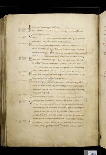 | Keywords: MCC-61050 Evangeliarium (Lebuïnuscodex) (219).jpg  Artwork nl Anonymous Noordoost-Frankrijk Anonymous Rijnland Anonymous Maasland nl De kern van de boekband van de Lebuïnuscodex wordt gevormd door twee eikenhouten platten De rug en het achterplat zijn overtrokken met zeemleer Het voorplat is rijkelijk versierd met verguld zilversmeedwerk reliëfs van walrustand en verscheidene stenen De compositie van de bekleding van het voorplat wordt bepaald door een verguld zilveren filigraankruis Aan de uiteinden van de kruisarmen bevinden zich vierpassen met overhoeks vierkant eveneens met filigraan gedecoreerd Hiervan zijn er slechts twee bewaard gebleven en wel die aan de verticale kruisarmen Zij bevatten tevens nog de oorspronkelijke versiering bestaande uit een filigraanmedaillon met een pseudo-camee van respectievelijk een mannen- en een vrouwenhoofd in profiel Het snijpunt van het kruis wordt ingenomen door een ver vooruitstekend Bacchuskopje in chalcedoon te herkennen aan de kleine druiventrosjes in zijn haartooi Het kopje is gevat in een filigraanmedaillon welke op zijn beurt weer is geplaatst op een vierpas van filigraanwerk Op elk van de kruisarmen bevindt zich een ovale steen 'en cabochon' op een medaillon met filigraan Het filigraanwerk van kruis en sierstukken is in de vorm van visblazen In de ruimten tussen de kruisarmen zijn rechthoekige reliëfs van walrustand aangebracht met de vier evangelisten en hun symbool De reliëfs hebben de volgende afmetingen H 10 0 x B 5 5 cm Van links boven naar rechts onder betreft het Mattheus met de engel Johannes met de adelaar Marcus met de gevleugelde leeuw en Lucas met de gevleugelde os De figuren zijn paarsgewijs als elkaars spiegelbeeld ten opzichte van de middenas geplaatst Mattheus en Johannes zitten vrijwel geheel frontaal terwijl Marcus en Lucas meer in profiel zijn afgebeeld Qua opbouw verschillen de vier reliëfs nauwelijks van elkaar Binnen een rand van vierlobbige blaadjes verheffen zich twee zuilen met een basis een kapiteel en een dekplaat Hierop rust een rondboog geflankeerd door twee torens en afgedekt met een fronton dat boven Mattheus en Johannes boogvormig en boven Marcus en Lucas driehoekig is Onder deze overhuiving zitten de evangelisten gekleed in een lang gewaad en mantel met gekruiste benen aan een lessenaar hun blote voeten rustend op een bankje Allen zijn baardeloos en voorzien van een nimbus Voorts houden ze een pen in hun rechterhand terwijl hun linker op een boek ligt of gebarend is opgeheven Boven elk van de evangelisten verschijnt in de opening van het fronton zijn symbool met een spreukband Dit rijkelijk gedecoreerde middenveld wordt omlijst door sierbanden van verguld koper De opbouw van de sierlijsten is steeds dezelfde een opstaande smalle band die op regelmatige afstanden is voorzien van holten met aan weerszijden een brede strook voorzien van een gestanst motief Aan de lange zijden van de boekband bestaat het motief uit palmetten aan de korte zijden uit rozetten Van deze laatstgenoemde stroken ontbreekt steeds de buitenste rand Bij alle stroken met palmettenmotief wijzen de palmetten naar links met uitzondering van de buitenste strook rechtsboven die het motief in tegengestelde richting toont Verguld zilveren rozetten op de hoeken van het voorplat omgeven door een smalle rand van filigraanwerk met cirkelmotief en bekroond met een 'en cabochon' gezette steen completeren het geheel Van de rozet links onder ontbreekt de steen en is slechts de buitenste rand over Aan de voorzijde van de boekband bevinden zich nog de rudimenten van twee sluitingen between u'825' u'1000' u'1150' u'850' u'1199' u'1199' nl perkament eikenhout zilver goud koper walrustand chalcedoon glas leer Size 35 5 26 0 cm nl Hoogte 35 5cm Breedte 26 0cm Diepte 13 5cm Institution Museum Catharijneconvent object history exhibition history credit line nl Foto Museum Catharijneconvent Utrecht foto HetFotoAtelier Peter Rothengatter accession number Object number 61050 Inventory number ABM h1 place of creation https //www catharijneconvent nl/adlib/61050/ View this work on the website of Museum Catharijneconvent Museum Catharijneconvent Cc-zero <gallery> File MCC-61050_Evangeliarium_Lebuïnuscodex_ 11 jpg File MCC-61050_Evangeliarium_Lebuïnuscodex_ 172 jpg File MCC-61050_Evangeliarium_Lebuïnuscodex_ 212 jpg File MCC-61050_Evangeliarium_Lebuïnuscodex_ 61 jpg File MCC-61050_Evangeliarium_Lebuïnuscodex_ 12 jpg File MCC-61050_Evangeliarium_Lebuïnuscodex_ 213 jpg File MCC-61050_Evangeliarium_Lebuïnuscodex_ 56 jpg File MCC-61050_Evangeliarium_Lebuïnuscodex_ 232 jpg File MCC-61050_Evangeliarium_Lebuïnuscodex_ 93 jpg File MCC-61050_Evangeliarium_Lebuïnuscodex_ 99 jpg File MCC-61050_Evangeliarium_Lebuïnuscodex_ 184 jpg File MCC-61050_Evangeliarium_Lebuïnuscodex_ 64 jpg File MCC-61050_Evangeliarium_Lebuïnuscodex_ 299 jpg File MCC-61050_Evangeliarium_Lebuïnuscodex_ 86 jpg File MCC-61050_Evangeliarium_Lebuïnuscodex_ 260 jpg File MCC-61050_Evangeliarium_Lebuïnuscodex_ 159 jpg File MCC-61050_Evangeliarium_Lebuïnuscodex_ 247 jpg File MCC-61050_Evangeliarium_Lebuïnuscodex_ 180 jpg File MCC-61050_Evangeliarium_Lebuïnuscodex_ 121 jpg File MCC-61050_Evangeliarium_Lebuïnuscodex_ 315 jpg File MCC-61050_Evangeliarium_Lebuïnuscodex_ 284 jpg File MCC-61050_Evangeliarium_Lebuïnuscodex_ 33 jpg File MCC-61050_Evangeliarium_Lebuïnuscodex_ 44 jpg File MCC-61050_Evangeliarium_Lebuïnuscodex_ 258 jpg File MCC-61050_Evangeliarium_Lebuïnuscodex_ 237 jpg File MCC-61050_Evangeliarium_Lebuïnuscodex_ 20 jpg File MCC-61050_Evangeliarium_Lebuïnuscodex_ 220 jpg File MCC-61050_Evangeliarium_Lebuïnuscodex_ 279 jpg File MCC-61050_Evangeliarium_Lebuïnuscodex_ 183 jpg File MCC-61050_Evangeliarium_Lebuïnuscodex_ 60 jpg File MCC-61050_Evangeliarium_Lebuïnuscodex_ 166 jpg File MCC-61050_Evangeliarium_Lebuïnuscodex_ 97 jpg File MCC-61050_Evangeliarium_Lebuïnuscodex_ 71 jpg File MCC-61050_Evangeliarium_Lebuïnuscodex_ 132 jpg File MCC-61050_Evangeliarium_Lebuï