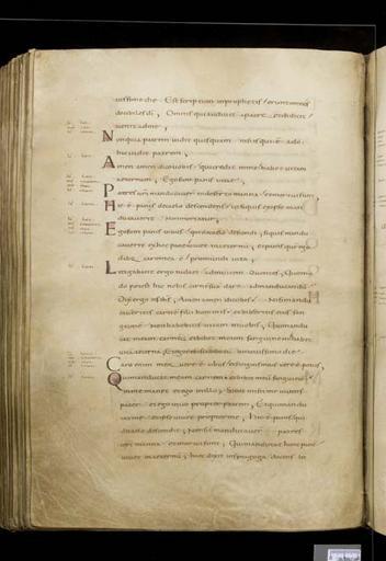 | Keywords: MCC-61050 Evangeliarium (Lebuïnuscodex) (242).jpg Artwork nl Anonymous Noordoost-Frankrijk Anonymous Rijnland Anonymous Maasland nl De kern van de boekband van de Lebuïnuscodex wordt gevormd door twee eikenhouten platten De rug en het achterplat zijn overtrokken met zeemleer Het voorplat is rijkelijk versierd met verguld zilversmeedwerk reliëfs van walrustand en verscheidene stenen De compositie van de bekleding van het voorplat wordt bepaald door een verguld zilveren filigraankruis Aan de uiteinden van de kruisarmen bevinden zich vierpassen met overhoeks vierkant eveneens met filigraan gedecoreerd Hiervan zijn er slechts twee bewaard gebleven en wel die aan de verticale kruisarmen Zij bevatten tevens nog de oorspronkelijke versiering bestaande uit een filigraanmedaillon met een pseudo-camee van respectievelijk een mannen- en een vrouwenhoofd in profiel Het snijpunt van het kruis wordt ingenomen door een ver vooruitstekend Bacchuskopje in chalcedoon te herkennen aan de kleine druiventrosjes in zijn haartooi Het kopje is gevat in een filigraanmedaillon welke op zijn beurt weer is geplaatst op een vierpas van filigraanwerk Op elk van de kruisarmen bevindt zich een ovale steen 'en cabochon' op een medaillon met filigraan Het filigraanwerk van kruis en sierstukken is in de vorm van visblazen In de ruimten tussen de kruisarmen zijn rechthoekige reliëfs van walrustand aangebracht met de vier evangelisten en hun symbool De reliëfs hebben de volgende afmetingen H 10 0 x B 5 5 cm Van links boven naar rechts onder betreft het Mattheus met de engel Johannes met de adelaar Marcus met de gevleugelde leeuw en Lucas met de gevleugelde os De figuren zijn paarsgewijs als elkaars spiegelbeeld ten opzichte van de middenas geplaatst Mattheus en Johannes zitten vrijwel geheel frontaal terwijl Marcus en Lucas meer in profiel zijn afgebeeld Qua opbouw verschillen de vier reliëfs nauwelijks van elkaar Binnen een rand van vierlobbige blaadjes verheffen zich twee zuilen met een basis een kapiteel en een dekplaat Hierop rust een rondboog geflankeerd door twee torens en afgedekt met een fronton dat boven Mattheus en Johannes boogvormig en boven Marcus en Lucas driehoekig is Onder deze overhuiving zitten de evangelisten gekleed in een lang gewaad en mantel met gekruiste benen aan een lessenaar hun blote voeten rustend op een bankje Allen zijn baardeloos en voorzien van een nimbus Voorts houden ze een pen in hun rechterhand terwijl hun linker op een boek ligt of gebarend is opgeheven Boven elk van de evangelisten verschijnt in de opening van het fronton zijn symbool met een spreukband Dit rijkelijk gedecoreerde middenveld wordt omlijst door sierbanden van verguld koper De opbouw van de sierlijsten is steeds dezelfde een opstaande smalle band die op regelmatige afstanden is voorzien van holten met aan weerszijden een brede strook voorzien van een gestanst motief Aan de lange zijden van de boekband bestaat het motief uit palmetten aan de korte zijden uit rozetten Van deze laatstgenoemde stroken ontbreekt steeds de buitenste rand Bij alle stroken met palmettenmotief wijzen de palmetten naar links met uitzondering van de buitenste strook rechtsboven die het motief in tegengestelde richting toont Verguld zilveren rozetten op de hoeken van het voorplat omgeven door een smalle rand van filigraanwerk met cirkelmotief en bekroond met een 'en cabochon' gezette steen completeren het geheel Van de rozet links onder ontbreekt de steen en is slechts de buitenste rand over Aan de voorzijde van de boekband bevinden zich nog de rudimenten van twee sluitingen between u'825' u'1000' u'1150' u'850' u'1199' u'1199' nl perkament eikenhout zilver goud koper walrustand chalcedoon glas leer Size 35 5 26 0 cm nl Hoogte 35 5cm Breedte 26 0cm Diepte 13 5cm Institution Museum Catharijneconvent object history exhibition history credit line nl Foto Museum Catharijneconvent Utrecht foto HetFotoAtelier Peter Rothengatter accession number Object number 61050 Inventory number ABM h1 place of creation https //www catharijneconvent nl/adlib/61050/ View this work on the website of Museum Catharijneconvent Museum Catharijneconvent Cc-zero <gallery> File MCC-61050_Evangeliarium_Lebuïnuscodex_ 11 jpg File MCC-61050_Evangeliarium_Lebuïnuscodex_ 172 jpg File MCC-61050_Evangeliarium_Lebuïnuscodex_ 212 jpg File MCC-61050_Evangeliarium_Lebuïnuscodex_ 61 jpg File MCC-61050_Evangeliarium_Lebuïnuscodex_ 12 jpg File MCC-61050_Evangeliarium_Lebuïnuscodex_ 213 jpg File MCC-61050_Evangeliarium_Lebuïnuscodex_ 56 jpg File MCC-61050_Evangeliarium_Lebuïnuscodex_ 232 jpg File MCC-61050_Evangeliarium_Lebuïnuscodex_ 93 jpg File MCC-61050_Evangeliarium_Lebuïnuscodex_ 99 jpg File MCC-61050_Evangeliarium_Lebuïnuscodex_ 184 jpg File MCC-61050_Evangeliarium_Lebuïnuscodex_ 64 jpg File MCC-61050_Evangeliarium_Lebuïnuscodex_ 299 jpg File MCC-61050_Evangeliarium_Lebuïnuscodex_ 86 jpg File MCC-61050_Evangeliarium_Lebuïnuscodex_ 260 jpg File MCC-61050_Evangeliarium_Lebuïnuscodex_ 159 jpg File MCC-61050_Evangeliarium_Lebuïnuscodex_ 247 jpg File MCC-61050_Evangeliarium_Lebuïnuscodex_ 180 jpg File MCC-61050_Evangeliarium_Lebuïnuscodex_ 121 jpg File MCC-61050_Evangeliarium_Lebuïnuscodex_ 315 jpg File MCC-61050_Evangeliarium_Lebuïnuscodex_ 284 jpg File MCC-61050_Evangeliarium_Lebuïnuscodex_ 33 jpg File MCC-61050_Evangeliarium_Lebuïnuscodex_ 44 jpg File MCC-61050_Evangeliarium_Lebuïnuscodex_ 258 jpg File MCC-61050_Evangeliarium_Lebuïnuscodex_ 237 jpg File MCC-61050_Evangeliarium_Lebuïnuscodex_ 20 jpg File MCC-61050_Evangeliarium_Lebuïnuscodex_ 220 jpg File MCC-61050_Evangeliarium_Lebuïnuscodex_ 279 jpg File MCC-61050_Evangeliarium_Lebuïnuscodex_ 183 jpg File MCC-61050_Evangeliarium_Lebuïnuscodex_ 60 jpg File MCC-61050_Evangeliarium_Lebuïnuscodex_ 166 jpg File MCC-61050_Evangeliarium_Lebuïnuscodex_ 97 jpg File MCC-61050_Evangeliarium_Lebuïnuscodex_ 71 jpg File MCC-61050_Evangeliarium_Lebuïnuscodex_ 132 jpg File MCC-61050_Evangeliarium_Lebuïn
