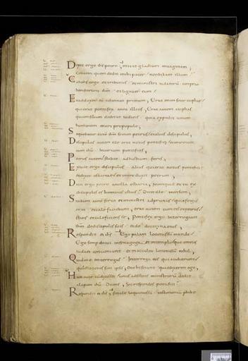 | Keywords: MCC-61050 Evangeliarium (Lebuïnuscodex) (274).jpg Artwork nl Anonymous Noordoost-Frankrijk Anonymous Rijnland Anonymous Maasland nl De kern van de boekband van de Lebuïnuscodex wordt gevormd door twee eikenhouten platten De rug en het achterplat zijn overtrokken met zeemleer Het voorplat is rijkelijk versierd met verguld zilversmeedwerk reliëfs van walrustand en verscheidene stenen De compositie van de bekleding van het voorplat wordt bepaald door een verguld zilveren filigraankruis Aan de uiteinden van de kruisarmen bevinden zich vierpassen met overhoeks vierkant eveneens met filigraan gedecoreerd Hiervan zijn er slechts twee bewaard gebleven en wel die aan de verticale kruisarmen Zij bevatten tevens nog de oorspronkelijke versiering bestaande uit een filigraanmedaillon met een pseudo-camee van respectievelijk een mannen- en een vrouwenhoofd in profiel Het snijpunt van het kruis wordt ingenomen door een ver vooruitstekend Bacchuskopje in chalcedoon te herkennen aan de kleine druiventrosjes in zijn haartooi Het kopje is gevat in een filigraanmedaillon welke op zijn beurt weer is geplaatst op een vierpas van filigraanwerk Op elk van de kruisarmen bevindt zich een ovale steen 'en cabochon' op een medaillon met filigraan Het filigraanwerk van kruis en sierstukken is in de vorm van visblazen In de ruimten tussen de kruisarmen zijn rechthoekige reliëfs van walrustand aangebracht met de vier evangelisten en hun symbool De reliëfs hebben de volgende afmetingen H 10 0 x B 5 5 cm Van links boven naar rechts onder betreft het Mattheus met de engel Johannes met de adelaar Marcus met de gevleugelde leeuw en Lucas met de gevleugelde os De figuren zijn paarsgewijs als elkaars spiegelbeeld ten opzichte van de middenas geplaatst Mattheus en Johannes zitten vrijwel geheel frontaal terwijl Marcus en Lucas meer in profiel zijn afgebeeld Qua opbouw verschillen de vier reliëfs nauwelijks van elkaar Binnen een rand van vierlobbige blaadjes verheffen zich twee zuilen met een basis een kapiteel en een dekplaat Hierop rust een rondboog geflankeerd door twee torens en afgedekt met een fronton dat boven Mattheus en Johannes boogvormig en boven Marcus en Lucas driehoekig is Onder deze overhuiving zitten de evangelisten gekleed in een lang gewaad en mantel met gekruiste benen aan een lessenaar hun blote voeten rustend op een bankje Allen zijn baardeloos en voorzien van een nimbus Voorts houden ze een pen in hun rechterhand terwijl hun linker op een boek ligt of gebarend is opgeheven Boven elk van de evangelisten verschijnt in de opening van het fronton zijn symbool met een spreukband Dit rijkelijk gedecoreerde middenveld wordt omlijst door sierbanden van verguld koper De opbouw van de sierlijsten is steeds dezelfde een opstaande smalle band die op regelmatige afstanden is voorzien van holten met aan weerszijden een brede strook voorzien van een gestanst motief Aan de lange zijden van de boekband bestaat het motief uit palmetten aan de korte zijden uit rozetten Van deze laatstgenoemde stroken ontbreekt steeds de buitenste rand Bij alle stroken met palmettenmotief wijzen de palmetten naar links met uitzondering van de buitenste strook rechtsboven die het motief in tegengestelde richting toont Verguld zilveren rozetten op de hoeken van het voorplat omgeven door een smalle rand van filigraanwerk met cirkelmotief en bekroond met een 'en cabochon' gezette steen completeren het geheel Van de rozet links onder ontbreekt de steen en is slechts de buitenste rand over Aan de voorzijde van de boekband bevinden zich nog de rudimenten van twee sluitingen between u'825' u'1000' u'1150' u'850' u'1199' u'1199' nl perkament eikenhout zilver goud koper walrustand chalcedoon glas leer Size 35 5 26 0 cm nl Hoogte 35 5cm Breedte 26 0cm Diepte 13 5cm Institution Museum Catharijneconvent object history exhibition history credit line nl Foto Museum Catharijneconvent Utrecht foto HetFotoAtelier Peter Rothengatter accession number Object number 61050 Inventory number ABM h1 place of creation https //www catharijneconvent nl/adlib/61050/ View this work on the website of Museum Catharijneconvent Museum Catharijneconvent Cc-zero <gallery> File MCC-61050_Evangeliarium_Lebuïnuscodex_ 11 jpg File MCC-61050_Evangeliarium_Lebuïnuscodex_ 172 jpg File MCC-61050_Evangeliarium_Lebuïnuscodex_ 212 jpg File MCC-61050_Evangeliarium_Lebuïnuscodex_ 61 jpg File MCC-61050_Evangeliarium_Lebuïnuscodex_ 12 jpg File MCC-61050_Evangeliarium_Lebuïnuscodex_ 213 jpg File MCC-61050_Evangeliarium_Lebuïnuscodex_ 56 jpg File MCC-61050_Evangeliarium_Lebuïnuscodex_ 232 jpg File MCC-61050_Evangeliarium_Lebuïnuscodex_ 93 jpg File MCC-61050_Evangeliarium_Lebuïnuscodex_ 99 jpg File MCC-61050_Evangeliarium_Lebuïnuscodex_ 184 jpg File MCC-61050_Evangeliarium_Lebuïnuscodex_ 64 jpg File MCC-61050_Evangeliarium_Lebuïnuscodex_ 299 jpg File MCC-61050_Evangeliarium_Lebuïnuscodex_ 86 jpg File MCC-61050_Evangeliarium_Lebuïnuscodex_ 260 jpg File MCC-61050_Evangeliarium_Lebuïnuscodex_ 159 jpg File MCC-61050_Evangeliarium_Lebuïnuscodex_ 247 jpg File MCC-61050_Evangeliarium_Lebuïnuscodex_ 180 jpg File MCC-61050_Evangeliarium_Lebuïnuscodex_ 121 jpg File MCC-61050_Evangeliarium_Lebuïnuscodex_ 315 jpg File MCC-61050_Evangeliarium_Lebuïnuscodex_ 284 jpg File MCC-61050_Evangeliarium_Lebuïnuscodex_ 33 jpg File MCC-61050_Evangeliarium_Lebuïnuscodex_ 44 jpg File MCC-61050_Evangeliarium_Lebuïnuscodex_ 258 jpg File MCC-61050_Evangeliarium_Lebuïnuscodex_ 237 jpg File MCC-61050_Evangeliarium_Lebuïnuscodex_ 20 jpg File MCC-61050_Evangeliarium_Lebuïnuscodex_ 220 jpg File MCC-61050_Evangeliarium_Lebuïnuscodex_ 279 jpg File MCC-61050_Evangeliarium_Lebuïnuscodex_ 183 jpg File MCC-61050_Evangeliarium_Lebuïnuscodex_ 60 jpg File MCC-61050_Evangeliarium_Lebuïnuscodex_ 166 jpg File MCC-61050_Evangeliarium_Lebuïnuscodex_ 97 jpg File MCC-61050_Evangeliarium_Lebuïnuscodex_ 71 jpg File MCC-61050_Evangeliarium_Lebuïnuscodex_ 132 jpg File MCC-61050_Evangeliarium_Lebuïn