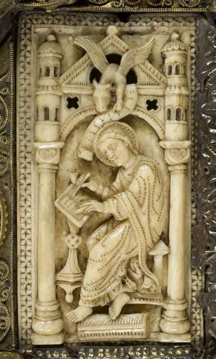 | Keywords: MCC-61050 Evangeliarium (Lebuïnuscodex) (337).jpg Artwork nl Anonymous Noordoost-Frankrijk Anonymous Rijnland Anonymous Maasland nl De kern van de boekband van de Lebuïnuscodex wordt gevormd door twee eikenhouten platten De rug en het achterplat zijn overtrokken met zeemleer Het voorplat is rijkelijk versierd met verguld zilversmeedwerk reliëfs van walrustand en verscheidene stenen De compositie van de bekleding van het voorplat wordt bepaald door een verguld zilveren filigraankruis Aan de uiteinden van de kruisarmen bevinden zich vierpassen met overhoeks vierkant eveneens met filigraan gedecoreerd Hiervan zijn er slechts twee bewaard gebleven en wel die aan de verticale kruisarmen Zij bevatten tevens nog de oorspronkelijke versiering bestaande uit een filigraanmedaillon met een pseudo-camee van respectievelijk een mannen- en een vrouwenhoofd in profiel Het snijpunt van het kruis wordt ingenomen door een ver vooruitstekend Bacchuskopje in chalcedoon te herkennen aan de kleine druiventrosjes in zijn haartooi Het kopje is gevat in een filigraanmedaillon welke op zijn beurt weer is geplaatst op een vierpas van filigraanwerk Op elk van de kruisarmen bevindt zich een ovale steen 'en cabochon' op een medaillon met filigraan Het filigraanwerk van kruis en sierstukken is in de vorm van visblazen In de ruimten tussen de kruisarmen zijn rechthoekige reliëfs van walrustand aangebracht met de vier evangelisten en hun symbool De reliëfs hebben de volgende afmetingen H 10 0 x B 5 5 cm Van links boven naar rechts onder betreft het Mattheus met de engel Johannes met de adelaar Marcus met de gevleugelde leeuw en Lucas met de gevleugelde os De figuren zijn paarsgewijs als elkaars spiegelbeeld ten opzichte van de middenas geplaatst Mattheus en Johannes zitten vrijwel geheel frontaal terwijl Marcus en Lucas meer in profiel zijn afgebeeld Qua opbouw verschillen de vier reliëfs nauwelijks van elkaar Binnen een rand van vierlobbige blaadjes verheffen zich twee zuilen met een basis een kapiteel en een dekplaat Hierop rust een rondboog geflankeerd door twee torens en afgedekt met een fronton dat boven Mattheus en Johannes boogvormig en boven Marcus en Lucas driehoekig is Onder deze overhuiving zitten de evangelisten gekleed in een lang gewaad en mantel met gekruiste benen aan een lessenaar hun blote voeten rustend op een bankje Allen zijn baardeloos en voorzien van een nimbus Voorts houden ze een pen in hun rechterhand terwijl hun linker op een boek ligt of gebarend is opgeheven Boven elk van de evangelisten verschijnt in de opening van het fronton zijn symbool met een spreukband Dit rijkelijk gedecoreerde middenveld wordt omlijst door sierbanden van verguld koper De opbouw van de sierlijsten is steeds dezelfde een opstaande smalle band die op regelmatige afstanden is voorzien van holten met aan weerszijden een brede strook voorzien van een gestanst motief Aan de lange zijden van de boekband bestaat het motief uit palmetten aan de korte zijden uit rozetten Van deze laatstgenoemde stroken ontbreekt steeds de buitenste rand Bij alle stroken met palmettenmotief wijzen de palmetten naar links met uitzondering van de buitenste strook rechtsboven die het motief in tegengestelde richting toont Verguld zilveren rozetten op de hoeken van het voorplat omgeven door een smalle rand van filigraanwerk met cirkelmotief en bekroond met een 'en cabochon' gezette steen completeren het geheel Van de rozet links onder ontbreekt de steen en is slechts de buitenste rand over Aan de voorzijde van de boekband bevinden zich nog de rudimenten van twee sluitingen between u'825' u'1000' u'1150' u'850' u'1199' u'1199' nl perkament eikenhout zilver goud koper walrustand chalcedoon glas leer Size 35 5 26 0 cm nl Hoogte 35 5cm Breedte 26 0cm Diepte 13 5cm Institution Museum Catharijneconvent object history exhibition history credit line nl Foto Museum Catharijneconvent Utrecht foto HetFotoAtelier Peter Rothengatter Reproduction title nl Boekband voorzijde evangelist accession number Object number 61050 Inventory number ABM h1 place of creation https //www catharijneconvent nl/adlib/61050/ View this work on the website of Museum Catharijneconvent Museum Catharijneconvent Cc-zero <gallery> File MCC-61050_Evangeliarium_Lebuïnuscodex_ 11 jpg File MCC-61050_Evangeliarium_Lebuïnuscodex_ 172 jpg File MCC-61050_Evangeliarium_Lebuïnuscodex_ 212 jpg File MCC-61050_Evangeliarium_Lebuïnuscodex_ 61 jpg File MCC-61050_Evangeliarium_Lebuïnuscodex_ 12 jpg File MCC-61050_Evangeliarium_Lebuïnuscodex_ 213 jpg File MCC-61050_Evangeliarium_Lebuïnuscodex_ 56 jpg File MCC-61050_Evangeliarium_Lebuïnuscodex_ 232 jpg File MCC-61050_Evangeliarium_Lebuïnuscodex_ 93 jpg File MCC-61050_Evangeliarium_Lebuïnuscodex_ 99 jpg File MCC-61050_Evangeliarium_Lebuïnuscodex_ 184 jpg File MCC-61050_Evangeliarium_Lebuïnuscodex_ 64 jpg File MCC-61050_Evangeliarium_Lebuïnuscodex_ 299 jpg File MCC-61050_Evangeliarium_Lebuïnuscodex_ 86 jpg File MCC-61050_Evangeliarium_Lebuïnuscodex_ 260 jpg File MCC-61050_Evangeliarium_Lebuïnuscodex_ 159 jpg File MCC-61050_Evangeliarium_Lebuïnuscodex_ 247 jpg File MCC-61050_Evangeliarium_Lebuïnuscodex_ 180 jpg File MCC-61050_Evangeliarium_Lebuïnuscodex_ 121 jpg File MCC-61050_Evangeliarium_Lebuïnuscodex_ 315 jpg File MCC-61050_Evangeliarium_Lebuïnuscodex_ 284 jpg File MCC-61050_Evangeliarium_Lebuïnuscodex_ 33 jpg File MCC-61050_Evangeliarium_Lebuïnuscodex_ 44 jpg File MCC-61050_Evangeliarium_Lebuïnuscodex_ 258 jpg File MCC-61050_Evangeliarium_Lebuïnuscodex_ 237 jpg File MCC-61050_Evangeliarium_Lebuïnuscodex_ 20 jpg File MCC-61050_Evangeliarium_Lebuïnuscodex_ 220 jpg File MCC-61050_Evangeliarium_Lebuïnuscodex_ 279 jpg File MCC-61050_Evangeliarium_Lebuïnuscodex_ 183 jpg File MCC-61050_Evangeliarium_Lebuïnuscodex_ 60 jpg File MCC-61050_Evangeliarium_Lebuïnuscodex_ 166 jpg File MCC-61050_Evangeliarium_Lebuïnuscodex_ 97 jpg File MCC-61050_Evangeliarium_Lebuïnuscodex_ 71 jpg File MCC-61050_Evangeliarium_Lebuïnu