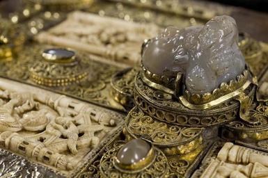 | Keywords: MCC-61050 Evangeliarium (Lebuïnuscodex) (319).jpg Artwork nl Anonymous Noordoost-Frankrijk Anonymous Rijnland Anonymous Maasland nl De kern van de boekband van de Lebuïnuscodex wordt gevormd door twee eikenhouten platten De rug en het achterplat zijn overtrokken met zeemleer Het voorplat is rijkelijk versierd met verguld zilversmeedwerk reliëfs van walrustand en verscheidene stenen De compositie van de bekleding van het voorplat wordt bepaald door een verguld zilveren filigraankruis Aan de uiteinden van de kruisarmen bevinden zich vierpassen met overhoeks vierkant eveneens met filigraan gedecoreerd Hiervan zijn er slechts twee bewaard gebleven en wel die aan de verticale kruisarmen Zij bevatten tevens nog de oorspronkelijke versiering bestaande uit een filigraanmedaillon met een pseudo-camee van respectievelijk een mannen- en een vrouwenhoofd in profiel Het snijpunt van het kruis wordt ingenomen door een ver vooruitstekend Bacchuskopje in chalcedoon te herkennen aan de kleine druiventrosjes in zijn haartooi Het kopje is gevat in een filigraanmedaillon welke op zijn beurt weer is geplaatst op een vierpas van filigraanwerk Op elk van de kruisarmen bevindt zich een ovale steen 'en cabochon' op een medaillon met filigraan Het filigraanwerk van kruis en sierstukken is in de vorm van visblazen In de ruimten tussen de kruisarmen zijn rechthoekige reliëfs van walrustand aangebracht met de vier evangelisten en hun symbool De reliëfs hebben de volgende afmetingen H 10 0 x B 5 5 cm Van links boven naar rechts onder betreft het Mattheus met de engel Johannes met de adelaar Marcus met de gevleugelde leeuw en Lucas met de gevleugelde os De figuren zijn paarsgewijs als elkaars spiegelbeeld ten opzichte van de middenas geplaatst Mattheus en Johannes zitten vrijwel geheel frontaal terwijl Marcus en Lucas meer in profiel zijn afgebeeld Qua opbouw verschillen de vier reliëfs nauwelijks van elkaar Binnen een rand van vierlobbige blaadjes verheffen zich twee zuilen met een basis een kapiteel en een dekplaat Hierop rust een rondboog geflankeerd door twee torens en afgedekt met een fronton dat boven Mattheus en Johannes boogvormig en boven Marcus en Lucas driehoekig is Onder deze overhuiving zitten de evangelisten gekleed in een lang gewaad en mantel met gekruiste benen aan een lessenaar hun blote voeten rustend op een bankje Allen zijn baardeloos en voorzien van een nimbus Voorts houden ze een pen in hun rechterhand terwijl hun linker op een boek ligt of gebarend is opgeheven Boven elk van de evangelisten verschijnt in de opening van het fronton zijn symbool met een spreukband Dit rijkelijk gedecoreerde middenveld wordt omlijst door sierbanden van verguld koper De opbouw van de sierlijsten is steeds dezelfde een opstaande smalle band die op regelmatige afstanden is voorzien van holten met aan weerszijden een brede strook voorzien van een gestanst motief Aan de lange zijden van de boekband bestaat het motief uit palmetten aan de korte zijden uit rozetten Van deze laatstgenoemde stroken ontbreekt steeds de buitenste rand Bij alle stroken met palmettenmotief wijzen de palmetten naar links met uitzondering van de buitenste strook rechtsboven die het motief in tegengestelde richting toont Verguld zilveren rozetten op de hoeken van het voorplat omgeven door een smalle rand van filigraanwerk met cirkelmotief en bekroond met een 'en cabochon' gezette steen completeren het geheel Van de rozet links onder ontbreekt de steen en is slechts de buitenste rand over Aan de voorzijde van de boekband bevinden zich nog de rudimenten van twee sluitingen between u'825' u'1000' u'1150' u'850' u'1199' u'1199' nl perkament eikenhout zilver goud koper walrustand chalcedoon glas leer Size 35 5 26 0 cm nl Hoogte 35 5cm Breedte 26 0cm Diepte 13 5cm Institution Museum Catharijneconvent object history exhibition history credit line nl Foto Museum Catharijneconvent Utrecht foto HetFotoAtelier Peter Rothengatter accession number Object number 61050 Inventory number ABM h1 place of creation https //www catharijneconvent nl/adlib/61050/ View this work on the website of Museum Catharijneconvent Museum Catharijneconvent Cc-zero <gallery> File MCC-61050_Evangeliarium_Lebuïnuscodex_ 11 jpg File MCC-61050_Evangeliarium_Lebuïnuscodex_ 172 jpg File MCC-61050_Evangeliarium_Lebuïnuscodex_ 212 jpg File MCC-61050_Evangeliarium_Lebuïnuscodex_ 61 jpg File MCC-61050_Evangeliarium_Lebuïnuscodex_ 12 jpg File MCC-61050_Evangeliarium_Lebuïnuscodex_ 213 jpg File MCC-61050_Evangeliarium_Lebuïnuscodex_ 56 jpg File MCC-61050_Evangeliarium_Lebuïnuscodex_ 232 jpg File MCC-61050_Evangeliarium_Lebuïnuscodex_ 93 jpg File MCC-61050_Evangeliarium_Lebuïnuscodex_ 99 jpg File MCC-61050_Evangeliarium_Lebuïnuscodex_ 184 jpg File MCC-61050_Evangeliarium_Lebuïnuscodex_ 64 jpg File MCC-61050_Evangeliarium_Lebuïnuscodex_ 299 jpg File MCC-61050_Evangeliarium_Lebuïnuscodex_ 86 jpg File MCC-61050_Evangeliarium_Lebuïnuscodex_ 260 jpg File MCC-61050_Evangeliarium_Lebuïnuscodex_ 159 jpg File MCC-61050_Evangeliarium_Lebuïnuscodex_ 247 jpg File MCC-61050_Evangeliarium_Lebuïnuscodex_ 180 jpg File MCC-61050_Evangeliarium_Lebuïnuscodex_ 121 jpg File MCC-61050_Evangeliarium_Lebuïnuscodex_ 315 jpg File MCC-61050_Evangeliarium_Lebuïnuscodex_ 284 jpg File MCC-61050_Evangeliarium_Lebuïnuscodex_ 33 jpg File MCC-61050_Evangeliarium_Lebuïnuscodex_ 44 jpg File MCC-61050_Evangeliarium_Lebuïnuscodex_ 258 jpg File MCC-61050_Evangeliarium_Lebuïnuscodex_ 237 jpg File MCC-61050_Evangeliarium_Lebuïnuscodex_ 20 jpg File MCC-61050_Evangeliarium_Lebuïnuscodex_ 220 jpg File MCC-61050_Evangeliarium_Lebuïnuscodex_ 279 jpg File MCC-61050_Evangeliarium_Lebuïnuscodex_ 183 jpg File MCC-61050_Evangeliarium_Lebuïnuscodex_ 60 jpg File MCC-61050_Evangeliarium_Lebuïnuscodex_ 166 jpg File MCC-61050_Evangeliarium_Lebuïnuscodex_ 97 jpg File MCC-61050_Evangeliarium_Lebuïnuscodex_ 71 jpg File MCC-61050_Evangeliarium_Lebuïnuscodex_ 132 jpg File MCC-61050_Evangeliarium_Lebuïn