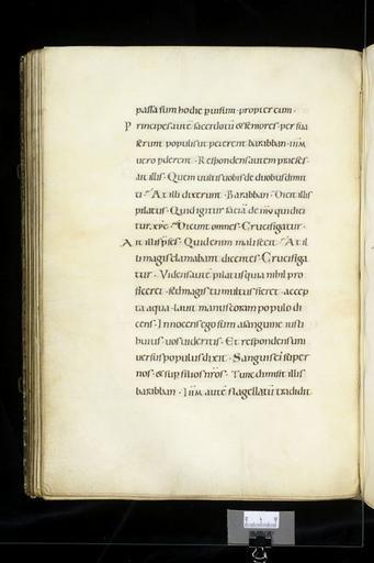 | Keywords: MCC-68515 Evangelistarium (Bernulphuscodex) (192).jpg Artwork nl Anonymous Zuid-Duitsland Reichenau OSB nl De kern van de boekband van de Bernulphuscodex wordt gevormd door twee eikenhouten platten De rug en het achterplat zijn overtrokken met zeemleer Het voorplat bestaat uit een enigszins verdiept rechthoekig middenveld omgeven door een brede rand In het middenveld bevindt zich een verguld zilveren filigraankruis met een verhoogd ingezwenkt achtkantig middenstuk en breed uitlopende armen Het filigraanwerk bestaat uit cirkelvormige uitwaaierende ranken met bolletjes aan de uiteinden en in het midden hier en daar kleine rozetjes Op het snijpunt van beide kruisarmen bevindt zich een ovale zwartblauw en grijs gekleurde onyx in de bovenarm een klassiek gesneden vrouwenkop van chalcedoon op de rechterarm een stuk donkerrood glas en beneden een bruin gestreepte agaat De bekleding van de linker kruisarm ontbreekt De lager gelegen velden tussen de kruisarmen zijn bekleed met dunne gouden platen Langs de randen hiervan is een parelrandje gestanst In het midden van de velden bevindt zich een medaillon met email-cloisonné De bovenste twee zijn voorzien van een diagonaal patroon met witte getrapte vierkantjes met rode stip tegen een donkerblauwe achtergrond Op de onderste twee is een stervormig respectievelijk concentrisch patroon aangebracht De aldaar toegepaste kleuren zijn translucide groen opaak wit geel en bruinpaars In de buitenste hoeken van de lager gelegen velden zijn ronde stenen in een vierkante zetting aangebracht Hiervan is slechts de opaal in de rechter bovenhoek bewaard gebleven In de overige hoeken is alleen nog de vierkante uitsparing te zien De brede rand is overtrokken met verguld zilveren stroken met grote rozetten die van elkaar gescheiden zijn door vier kleine stippelroosjes tussen twee evenwijdig lopende parelrandjes Aan de korte zijden van het voorplat ontbreekt de rozettenrand; slechts de spijkers waarmee ze waren vastgemaakt zijn nog te zien Aan de lange zijde ontbreekt een stuk uit de rand en wel links onder het midden Verdeeld over de nog aanwezige rozetten zijn vier alsengemmen en twee zilveren medaillons aangebracht Laatstgenoemde zijn versierd met een gezicht en bladwerk Vier medaillons met de evangelistensymbolen zijn op de hoeken van de brede rand aangebracht van links boven naar rechts onder betreft het de adelaar van Johannes de engel van Mattheus de gevleugelde os van Lucas en de gevleugelde leeuw van Marcus De banderol die de figuren dragen vermeldt de naam van de betreffende evangelist De naam van Marcus staat in spiegelbeeld Het woord Lucas is over andere letters gekrast De armen van het kruis de acht segmenten van het middenstuk alsmede de sierstukken zijn omlijst met een fijn geparelde gouden filigraandraad Techniek nog in te vullen volgens Korteweg zijn de medaillons met symbolen van Marcus en Lucas uit een graveerplaat gezaagd; rozetten in rand gestanst De sierlijst met rozetten is met behulp van kleine spijkertjes op de houten rand bevestigd Staat nog in te vullen Volgens Korteweg 1979 waren de medaillons met de symbolen van Johannes en Mattheus oorspronkelijk geëmailleerd De velden vertonen nog sporen van gekleurd email Volgens Steenbock 1965 waren het juist de medaillons met Lucas en Marcus Volgens Korteweg 1979 is het verguldsel van de stroken met rozetten enigszins afgesleten Onder de linkerzijde van het metaalwerk van het voorplat bevindt zich rode zijde; aan de smalle zijden van het voorplat ontbreken de rozettenranden slechts de spijkers waarmee ze waren vastgemaakt zijn nog te zien Aan de lange zijde links onder het midden ontbreekt een stuk uit de rand Van het chalcedonen vrouwenkopje ontbreekt de neus en is de kin beschadigd between u'1040' u'1200' u'1050' u'1499' nl perkament eikenhout zilver goud chalcedoon onyx glas agaat opaal Size 31 5 24 0 cm nl Hoogte 31 5cm Breedte 24 0cm Diepte 9 8cm Institution Museum Catharijneconvent object history exhibition history credit line nl Foto Museum Catharijneconvent Utrecht foto HetFotoAtelier Peter Rothengatter accession number Object number 68515 Inventory number ABM h3 place of creation https //www catharijneconvent nl/adlib/68515/ View this work on the website of Museum Catharijneconvent Museum Catharijneconvent Cc-zero <gallery> File MCC-68515_Evangelistarium_Bernulphuscodex_ 353 jpg File MCC-68515_Evangelistarium_Bernulphuscodex_ 412 jpg File MCC-68515_Evangelistarium_Bernulphuscodex_ 160 jpg File MCC-68515_Evangelistarium_Bernulphuscodex_ 6 jpg File MCC-68515_Evangelistarium_Bernulphuscodex_ 393 jpg File MCC-68515_Evangelistarium_Bernulphuscodex_ 89 jpg File MCC-68515_Evangelistarium_Bernulphuscodex_ 270 jpg File MCC-68515_Evangelistarium_Bernulphuscodex_ 425 jpg File MCC-68515_Evangelistarium_Bernulphuscodex_ 104 jpg File MCC-68515_Evangelistarium_Bernulphuscodex_ 291 jpg File MCC-68515_Evangelistarium_Bernulphuscodex_ 398 jpg File MCC-68515_Evangelistarium_Bernulphuscodex_ 339 jpg File MCC-68515_Evangelistarium_Bernulphuscodex_ 65 jpg File MCC-68515_Evangelistarium_Bernulphuscodex_ 403 jpg File MCC-68515_Evangelistarium_Bernulphuscodex_ 311 jpg File MCC-68515_Evangelistarium_Bernulphuscodex_ 159 jpg File MCC-68515_Evangelistarium_Bernulphuscodex_ 347 jpg File MCC-68515_Evangelistarium_Bernulphuscodex_ 453 jpg File MCC-68515_Evangelistarium_Bernulphuscodex_ 289 jpg File MCC-68515_Evangelistarium_Bernulphuscodex_ 273 jpg File MCC-68515_Evangelistarium_Bernulphuscodex_ 286 jpg File MCC-68515_Evangelistarium_Bernulphuscodex_ 236 jpg File MCC-68515_Evangelistarium_Bernulphuscodex_ 447 jpg File MCC-68515_Evangelistarium_Bernulphuscodex_ 227 jpg File MCC-68515_Evangelistarium_Bernulphuscodex_ 110 jpg File MCC-68515_Evangelistarium_Bernulphuscodex_ 139 jpg File MCC-68515_Evangelistarium_Bernulphuscodex_ 276 jpg File MCC-68515_Evangelistarium_Bernulphuscodex_ 10 jpg File MCC-68515_Evangelistarium_Bernulphuscodex_ 325 jpg File MCC-68515_Evangelistarium_Bernulphuscodex_ 154 jpg File MCC-68515_