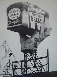 | Keywords: Landmark, rooftop signage on the McGavin Bakery building on the SW corner of West Broadway and Arbutus Street in Vancouver, BC. The stand-out display was installed in 1947 and eventually deteriorated to the point of removal circa-1973. The hand had a shirt cuff but lost it to a wind storm. [Photo by Henri Robideau] Landmark, rooftop signage on the McGavin Bakery building on the SW corner of West Broadway and Arbutus Street in Vancouver, BC. The stand-out display was installed in 1947 and eventually deteriorated to the point of removal circa-1973. The hand had a shirt cuff but lost it to a wind storm. [Photo by Henri Robideau] |