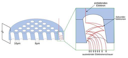 | Keywords: Mcp-de.svg schematische Darstellung einer Mikrokanalplatte Micro channel plate inklusiver dreifacher Kaskade vereinfacht in Vergrößerung - deutsche Beschriftung micro channel plate with magnification of a triple cascade simplified - german labels Own 01 40 11 January 2008 UTC Andreas 06 free to use without restrictions Microchannel plates |