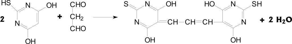| Keywords: MDA TBA reaction 01.svg Die Reaktion von Malondialdehyd MDA mit zwei Molekülen Thiobarbitursäure TBA zu einem Farbstoff The raction of malondialdehde MDA with twi molecules of thiobarbituric acid TBA forming a dye own 2011-06-13 Kuebi Armin Kübelbeck Aldehydes |