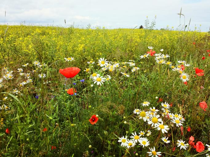 Keywords: meadow flowers field poppies poppy cornflowers chamomile rapeseed corn heat plants summer nature landscape grass poland