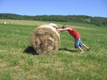 Keywords: meadow hay boy playing fun pushing hay bale bale