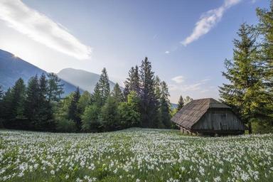 Keywords: meadow hut stable mountains range highlands blooming blossoms grass flowers trees coniferes traditional wooden shelter cabin nature view alpine building scenery nobody spring idyllic