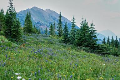 Keywords: meadow mountain landscape nature summer trees outdoor flowers