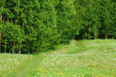 Keywords: meadow summer path pathway dandelions forest trees sunny day green field foliage lawn nature background grass