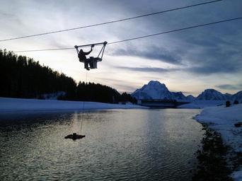 | Keywords: usgs science water streamgage wy snake river snakeriver measurement silhouette river stream outdoor USGS hydrologic technician Bob Reaves collects streamflow measurements from the cableway at the USGS streamgage on the Snake River near Moran, WY. Jackson Lake Dam is shown in the background. Location: USGS streamgage station 13011000, Snake River near Moran, WY, Grand Teton National Park. Credit: Nathan "Jake" Jacobson, USGS USGS hydrologic technician Bob Reaves collects streamflow measurements from the cableway at the USGS streamgage on the Snake River near Moran, WY. Jackson Lake Dam is shown in the background. Location: USGS streamgage station 13011000, Snake River near Moran, WY, Grand Teton National Park. Credit: Nathan "Jake" Jacobson, USGS |