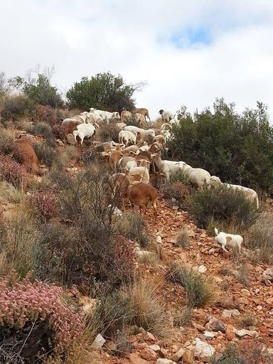 Keywords: Meatmaster Sheep4.jpg en Meatmaster Sheep flock browsing in mountain veldt in South Africa own Justice Malanot 2013-07-06 Cc-zero Meatmaster sheep