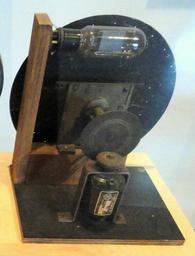 | Keywords: Mechanical television receiver 1927 - Indiana State Museum.JPG mechanical television receiver built by Morris VanWay for RCA in 1927 The video signal from a receiver was applied to the neon bulb at top and it was viewed through holes in the spinning disk Nipkow disk at rear which created the scan lines resulting in a dim orange monocolor image about one inch square Before modern electronic scan television systems were developed around World War 2 the first television systems used this mechanical scan technology By 1930 many radio stations broadcast experimental television programs which could be viewed using televisors like this Mechanical scan television never achieved high enough picture quality to be popular with the public The resolution of this televisor was probably 32 lines at 15 or 20 frames/second <br/><br/> Alterations to original image cropped other items out of picture 2011-03-31 16 47 41 Derived from Radio equipment - Indiana State Museum - DSC00410 JPG Original image Daderot Derived image Chetvorno Original image donated to public domain by Daderot other versions Radio equipment - Indiana State Museum - DSC00410 JPG Uploaded with UploadWizard Mechanical-scan television systems History of television |